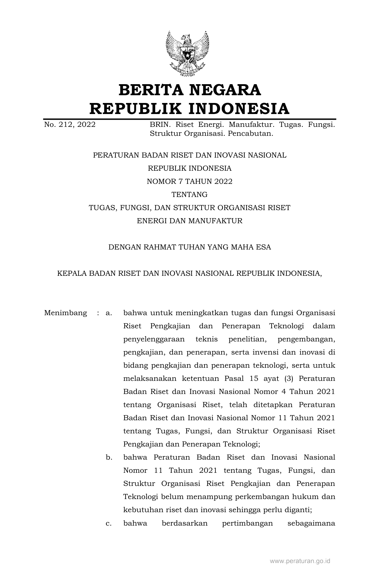 PERBAN Nomor 7 Tahun 2022 | Peraturan Badan Nomor 7 Tahun 2022 tentang TUGAS, FUNGSI, DAN STRUKTUR ORGANISASI RISET ENERGI DAN MANUFAKTUR