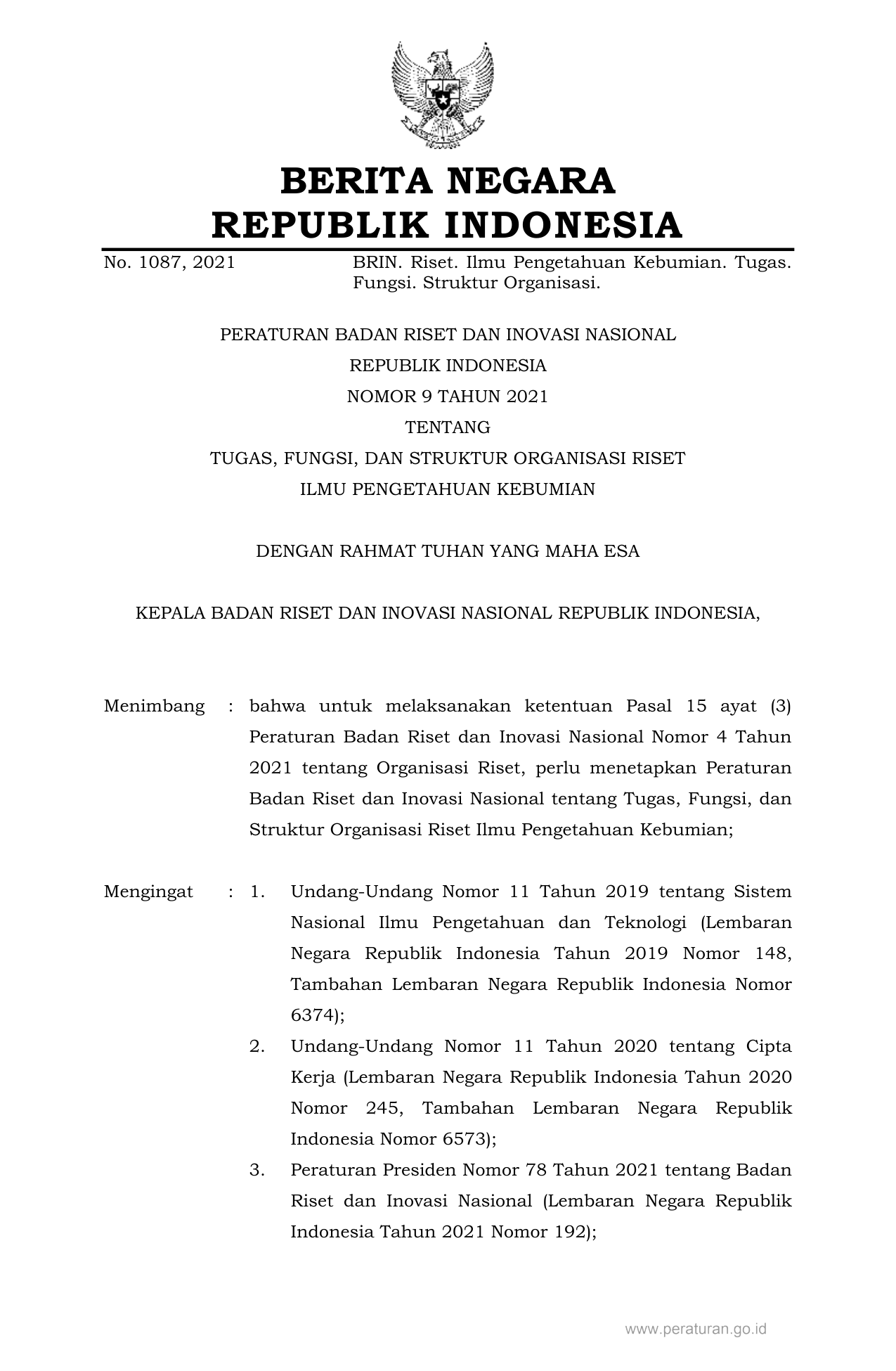 PERBAN Nomor 9 Tahun 2021 | Peraturan Badan Nomor 9 Tahun 2021 tentang TUGAS, FUNGSI, DAN STRUKTUR ORGANISASI RISET ILMU PENGETAHUAN KEBUMIAN