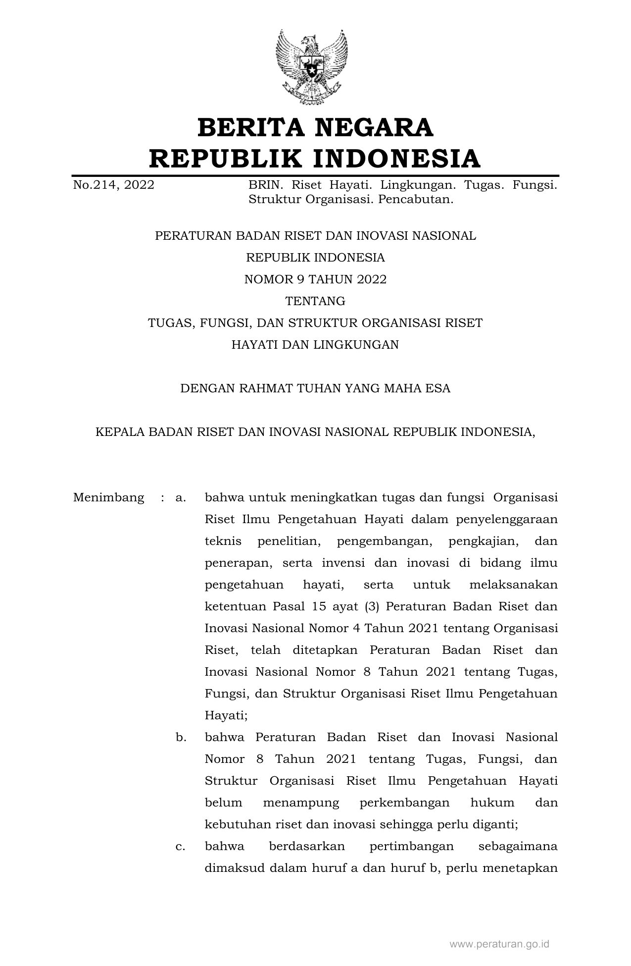 PERBAN Nomor 9 Tahun 2022 | Peraturan Badan Nomor 9 Tahun 2022 tentang TUGAS, FUNGSI, DAN STRUKTUR ORGANISASI RISET HAYATI DAN LINGKUNGAN