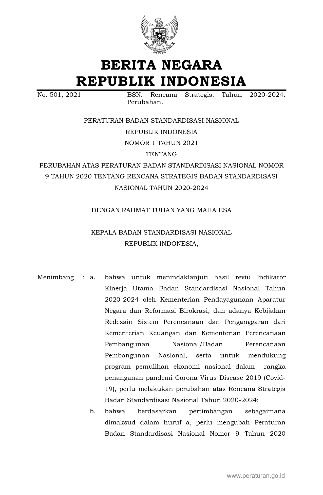 PERBAN Nomor 1 Tahun 2021 | Peraturan Badan Nomor 1 Tahun 2021 tentang PERUBAHAN ATAS PERATURAN BADAN STANDARDISASI NASIONAL NOMOR 9 TAHUN 2020 TENTANG RENCANA STRATEGIS BADAN STANDARDISASI NASIONAL TAHUN 2020-2024