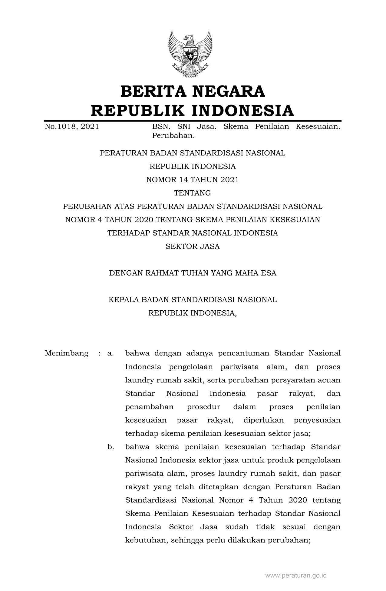 PERBAN Nomor 14 Tahun 2021 | Peraturan Badan Nomor 14 Tahun 2021 tentang PERUBAHAN ATAS PERATURAN BADAN STANDARDISASI NASIONAL NOMOR 4 TAHUN 2020 TENTANG SKEMA PENILAIAN KESESUAIAN TERHADAP STANDAR NASIONAL INDONESIA SEKTOR JASA