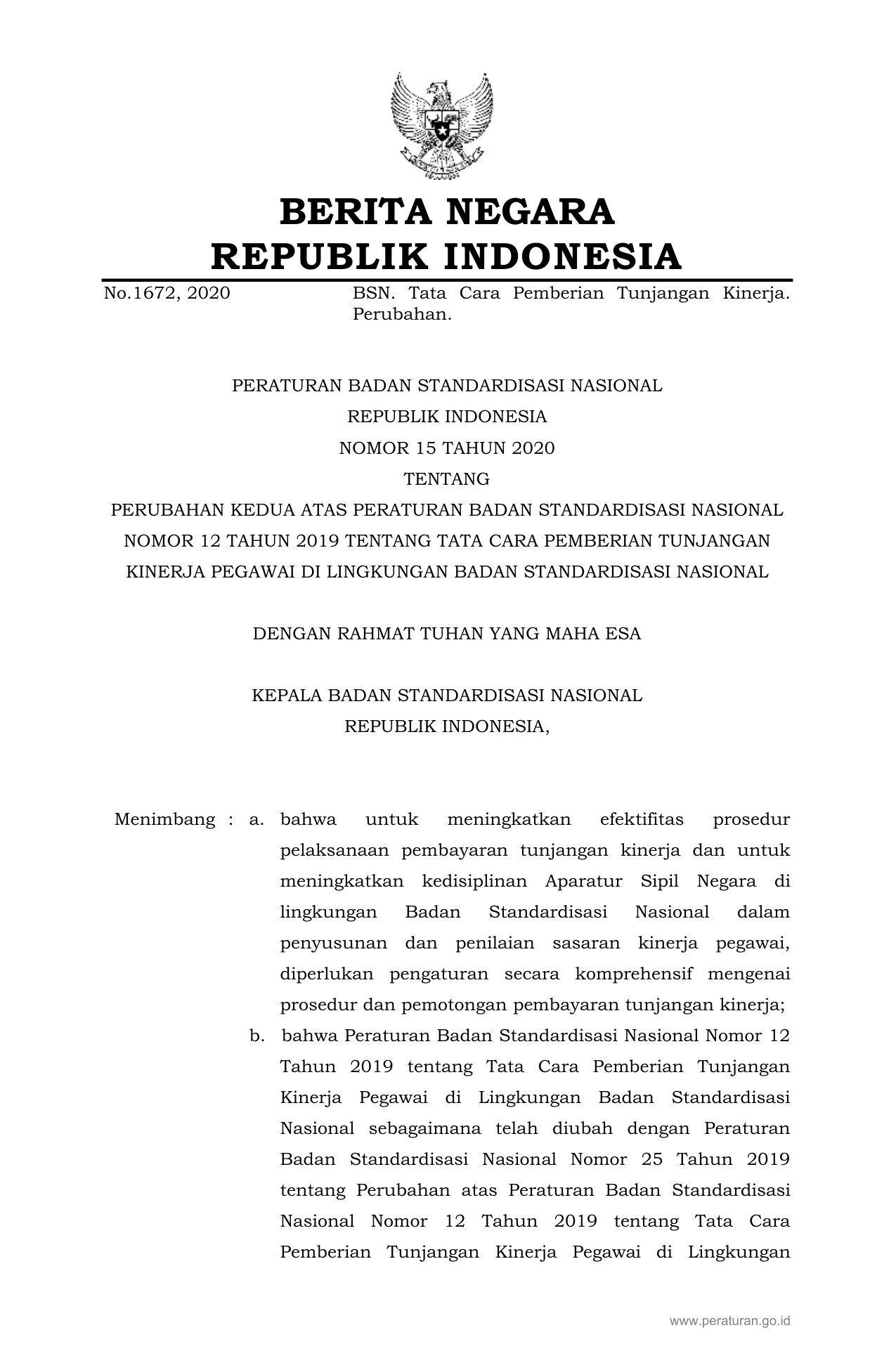 PERBAN Nomor 15 Tahun 2020 | Peraturan Badan Nomor 15 Tahun 2020 tentang PERUBAHAN KEDUA ATAS PERATURAN BADAN STANDARDISASI NASIONAL NOMOR 12 TAHUN 2019 TENTANG TATA CARA PEMBERIAN TUNJANGAN KINERJA PEGAWAI DI LINGKUNGAN BADAN STANDARDISASI NASIONAL