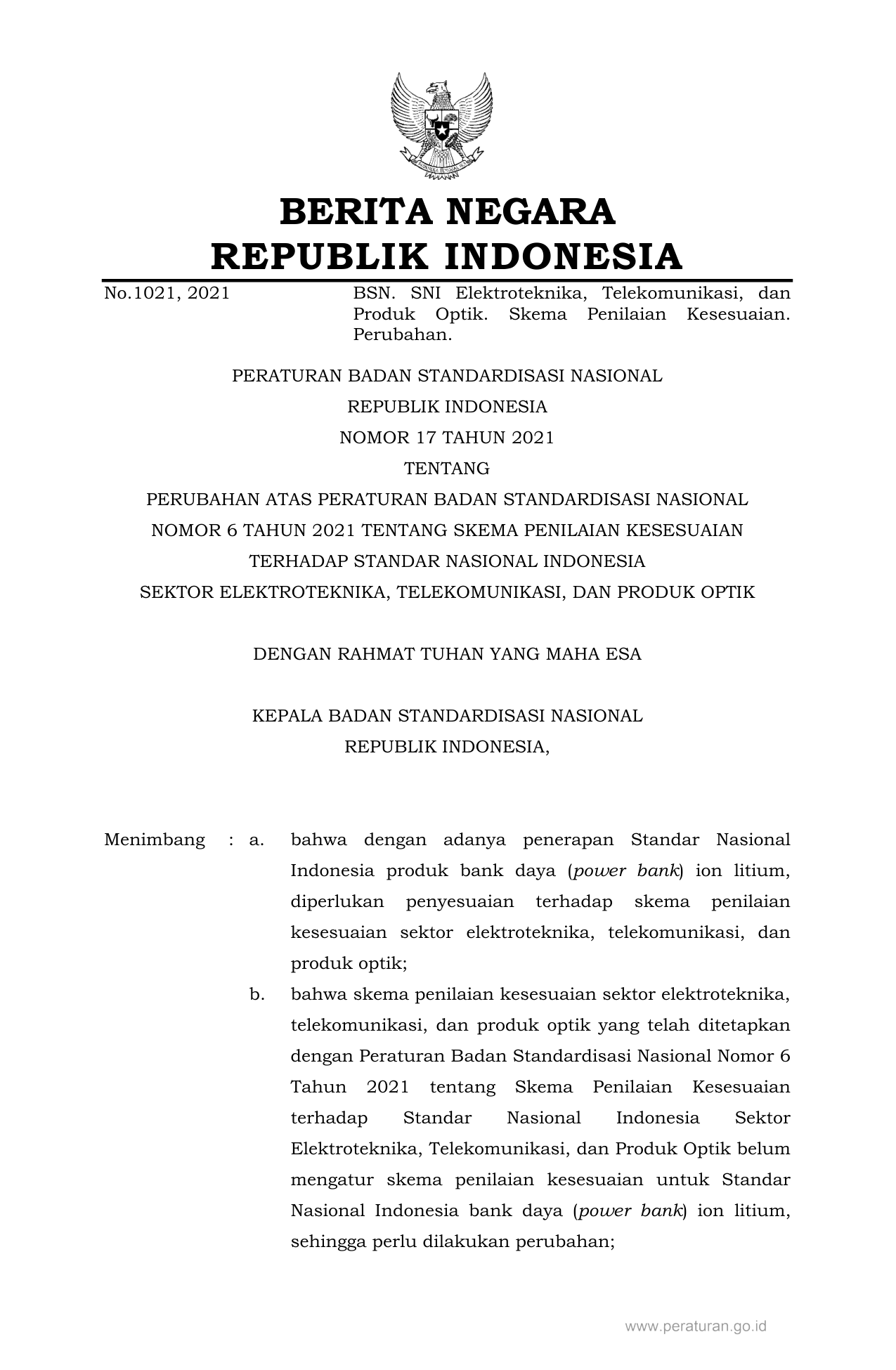 PERBAN Nomor 17 Tahun 2021 | Peraturan Badan Nomor 17 Tahun 2021 tentang PERUBAHAN ATAS PERATURAN BADAN STANDARDISASI NASIONAL NOMOR 6 TAHUN 2021 TENTANG SKEMA PENILAIAN KESESUAIAN TERHADAP STANDAR NASIONAL INDONESIA SEKTOR ELEKTROTEKNIKA, TELEKOMUNIKASI, DAN PRODUK OPTIK