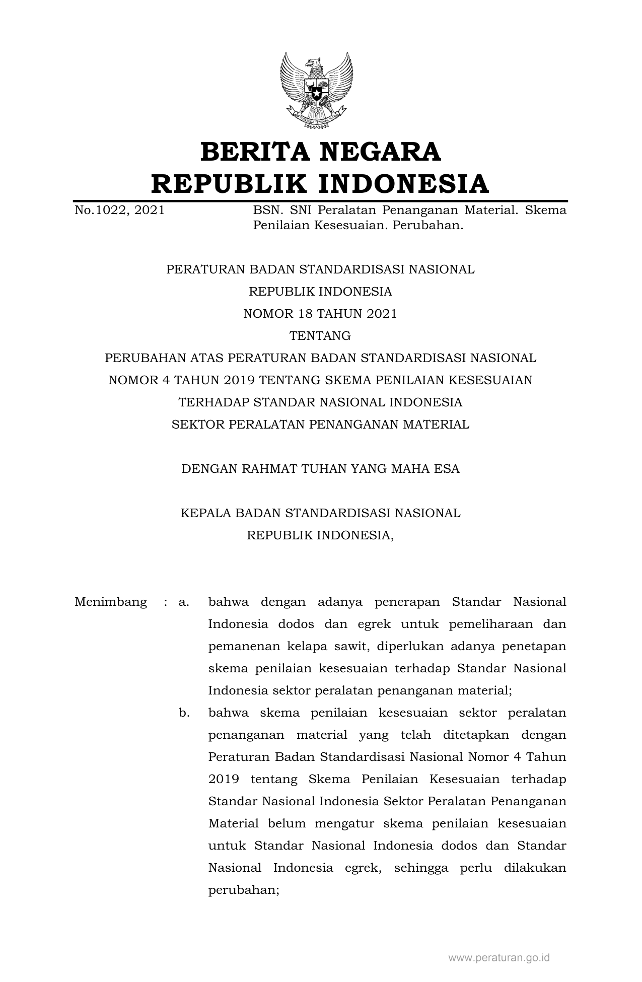 PERBAN Nomor 18 Tahun 2021 | Peraturan Badan Nomor 18 Tahun 2021 tentang PERUBAHAN ATAS PERATURAN BADAN STANDARDISASI NASIONAL NOMOR 4 TAHUN 2019 TENTANG SKEMA PENILAIAN KESESUAIAN TERHADAP STANDAR NASIONAL INDONESIA SEKTOR PERALATAN PENANGANAN MATERIAL