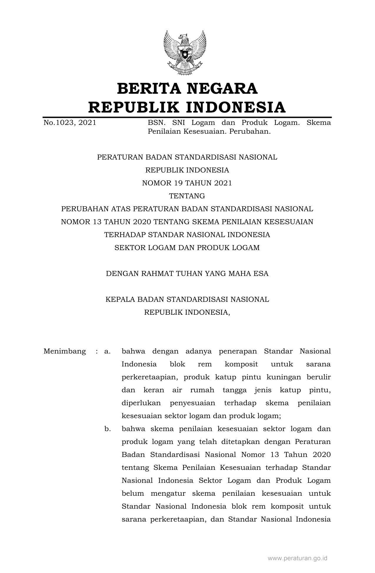 PERBAN Nomor 19 Tahun 2021 | Peraturan Badan Nomor 19 Tahun 2021 tentang PERUBAHAN ATAS PERATURAN BADAN STANDARDISASI NASIONAL NOMOR 13 TAHUN 2020 TENTANG SKEMA PENILAIAN KESESUAIAN TERHADAP STANDAR NASIONAL INDONESIA SEKTOR LOGAM DAN PRODUK LOGAM