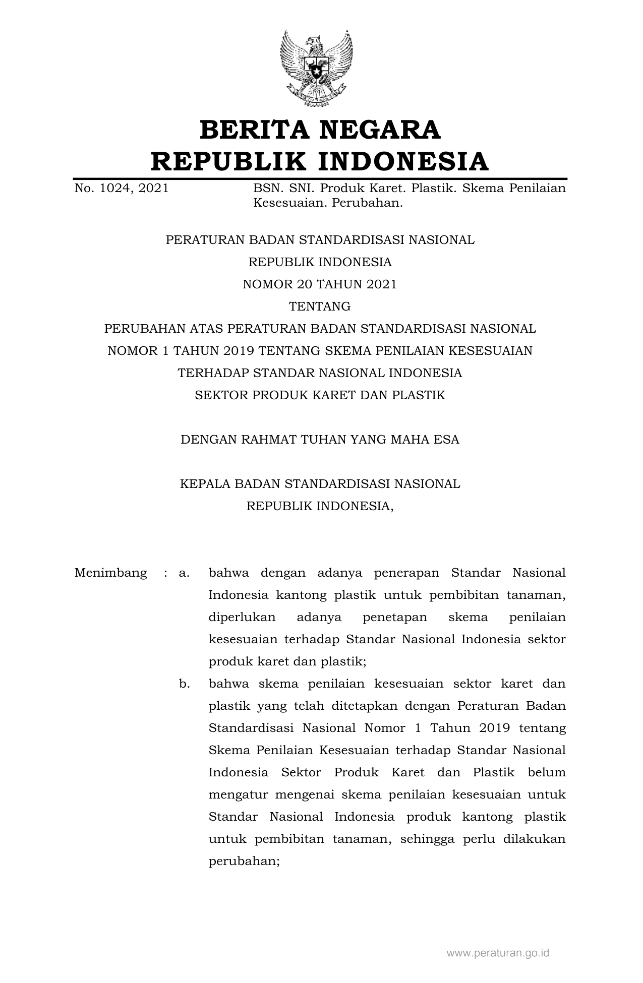PERBAN Nomor 20 Tahun 2021 | Peraturan Badan Nomor 20 Tahun 2021 tentang PERUBAHAN ATAS PERATURAN BADAN STANDARDISASI NASIONAL NOMOR 1 TAHUN 2019 TENTANG SKEMA PENILAIAN KESESUAIAN TERHADAP STANDAR NASIONAL INDONESIA SEKTOR PRODUK KARET DAN PLASTIK