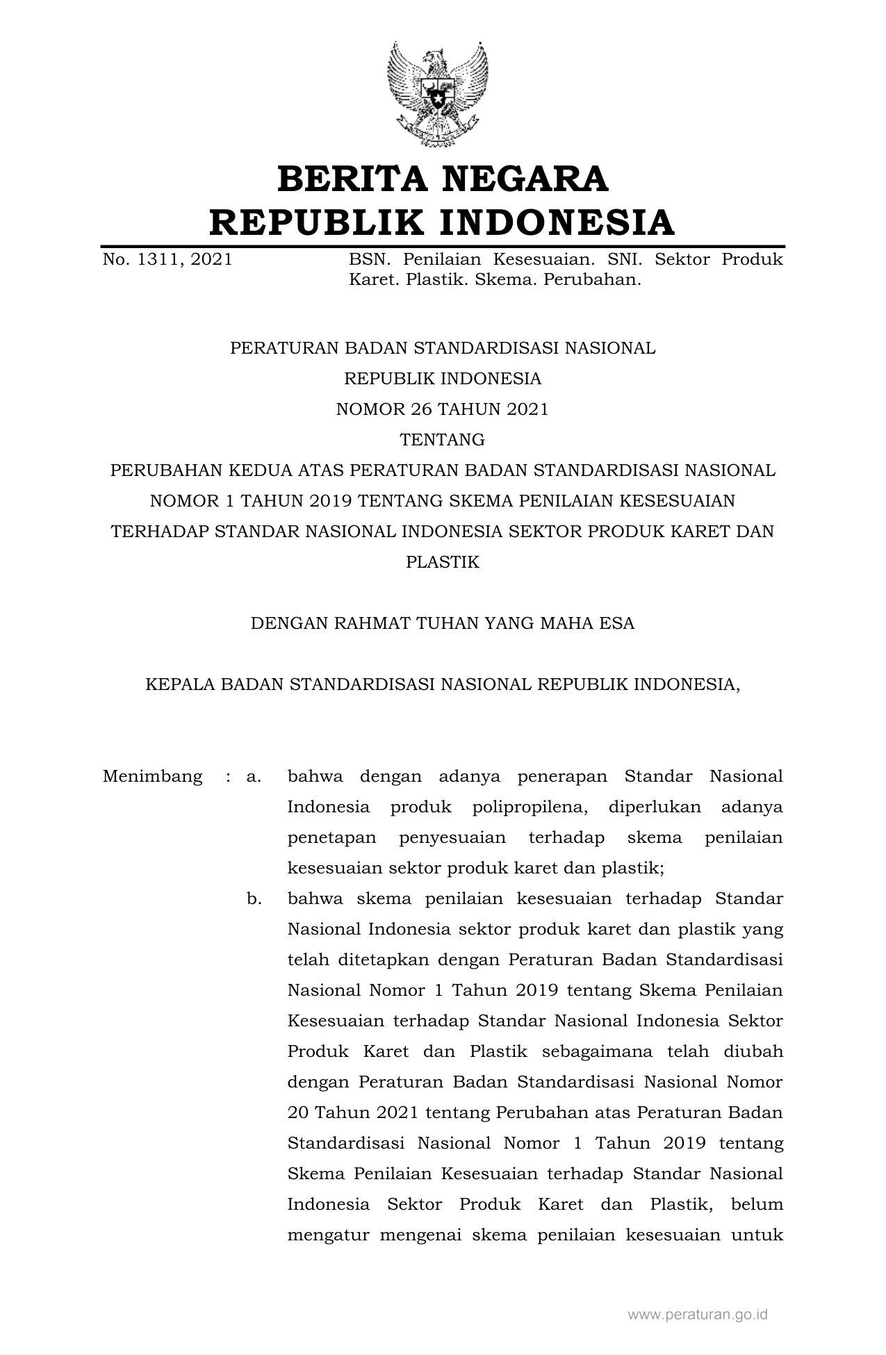 PERBAN Nomor 26 Tahun 2021 | Peraturan Badan Nomor 26 Tahun 2021 tentang PERUBAHAN KEDUA ATAS PERATURAN BADAN STANDARDISASI NASIONAL NOMOR 1 TAHUN 2019 TENTANG SKEMA PENILAIAN KESESUAIAN TERHADAP STANDAR NASIONAL INDONESIA SEKTOR PRODUK KARET DAN PLASTIK