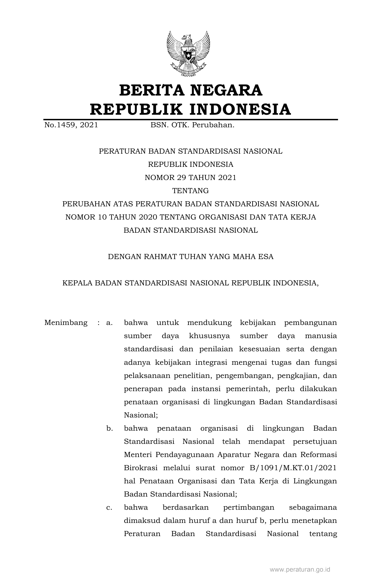 PERBAN Nomor 29 Tahun 2021 | Peraturan Badan Nomor 29 Tahun 2021 tentang PERUBAHAN ATAS PERATURAN BADAN STANDARDISASI NASIONAL NOMOR 10 TAHUN 2020 TENTANG ORGANISASI DAN TATA KERJA BADAN STANDARDISASI NASIONAL