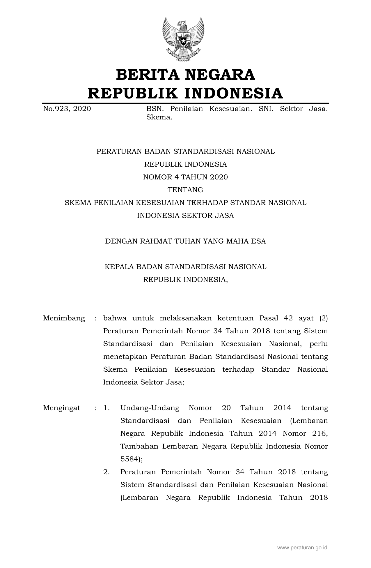 PERBAN Nomor 4 Tahun 2020 | Peraturan Badan Nomor 4 Tahun 2020 tentang SKEMA PENILAIAN KESESUAIAN TERHADAP STANDAR NASIONAL INDONESIA SEKTOR JASA
