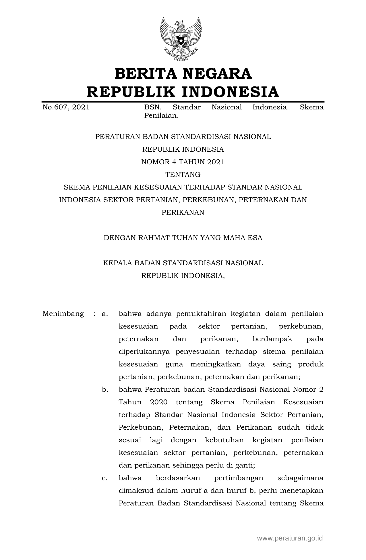PERBAN Nomor 4 Tahun 2021 | Peraturan Badan Nomor 4 Tahun 2021 tentang SKEMA PENILAIAN KESESUAIAN TERHADAP STANDAR NASIONAL INDONESIA SEKTOR PERTANIAN, PERKEBUNAN, PETERNAKAN DAN PERIKANAN