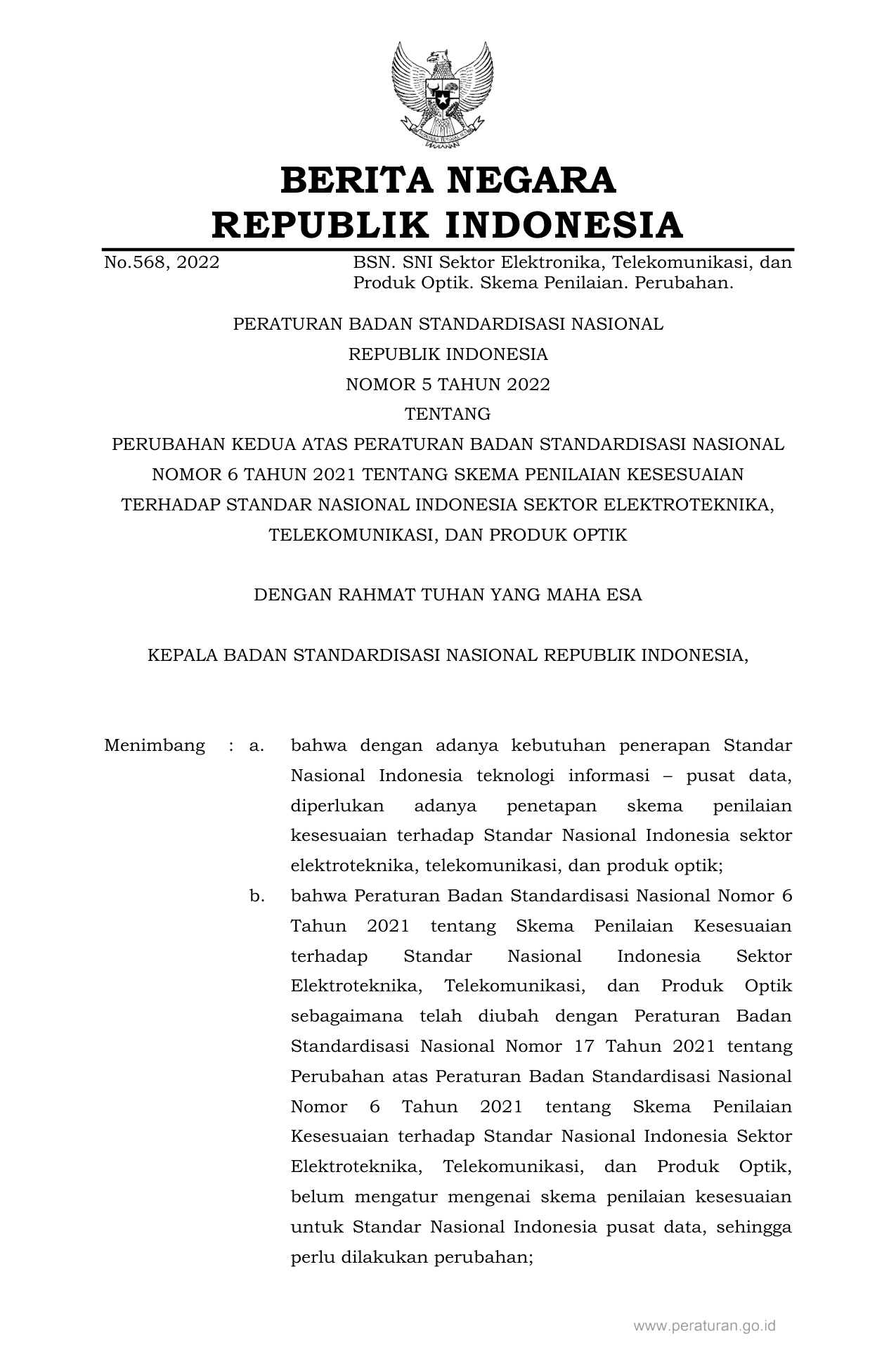 PERBAN Nomor 5 Tahun 2022 | Peraturan Badan Nomor 5 Tahun 2022 tentang PERUBAHAN KEDUA ATAS PERATURAN BADAN STANDARDISASI NASIONAL NOMOR 6 TAHUN 2021 TENTANG SKEMA PENILAIAN KESESUAIAN TERHADAP STANDAR NASIONAL INDONESIA SEKTOR ELEKTROTEKNIKA, TELEKOMUNIKASI, DAN PRODUK OPTIK