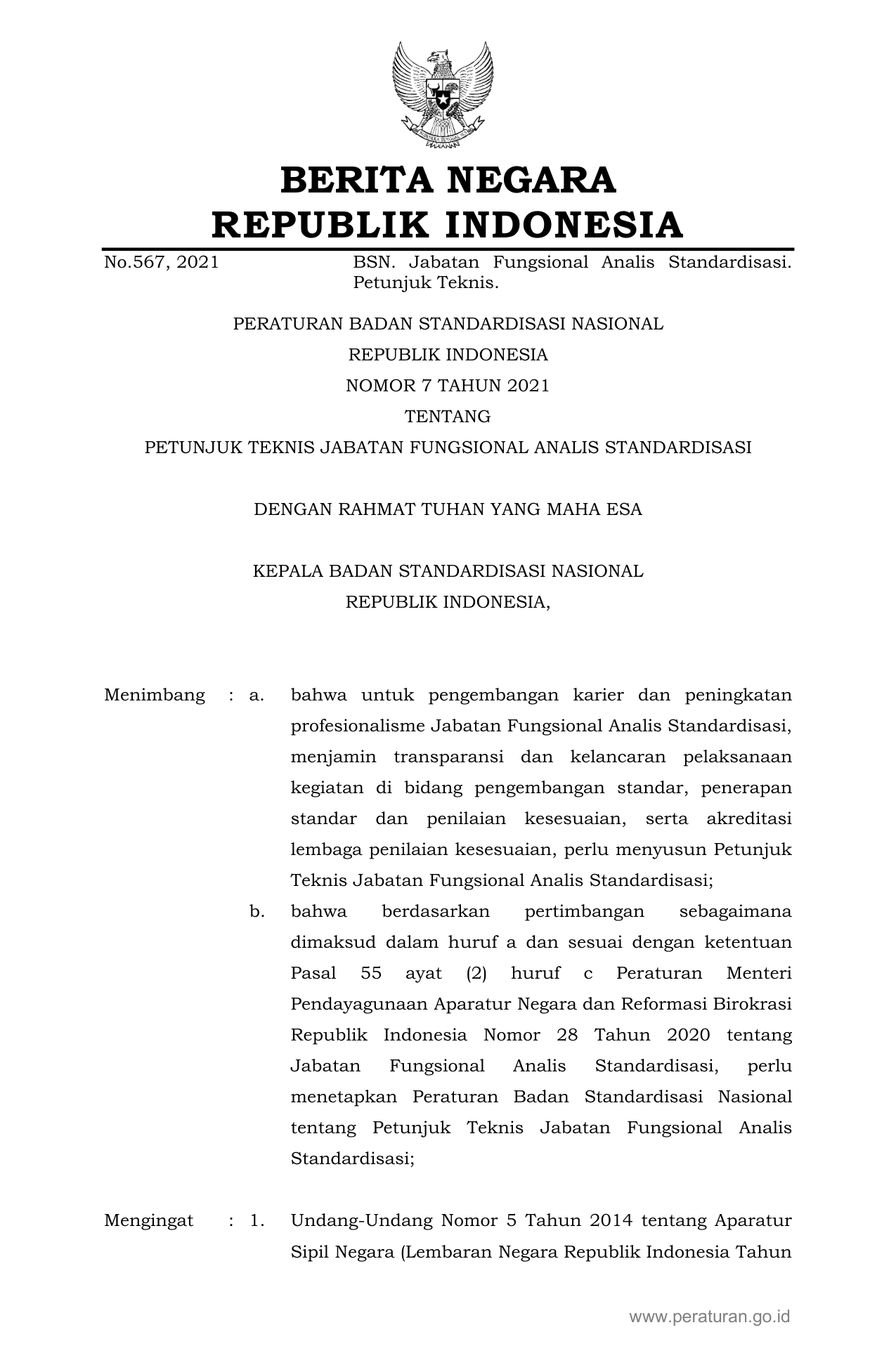 PERBAN Nomor 7 Tahun 2021 | Peraturan Badan Nomor 7 Tahun 2021 tentang PETUNJUK TEKNIS JABATAN FUNGSIONAL ANALIS STANDARDISASI