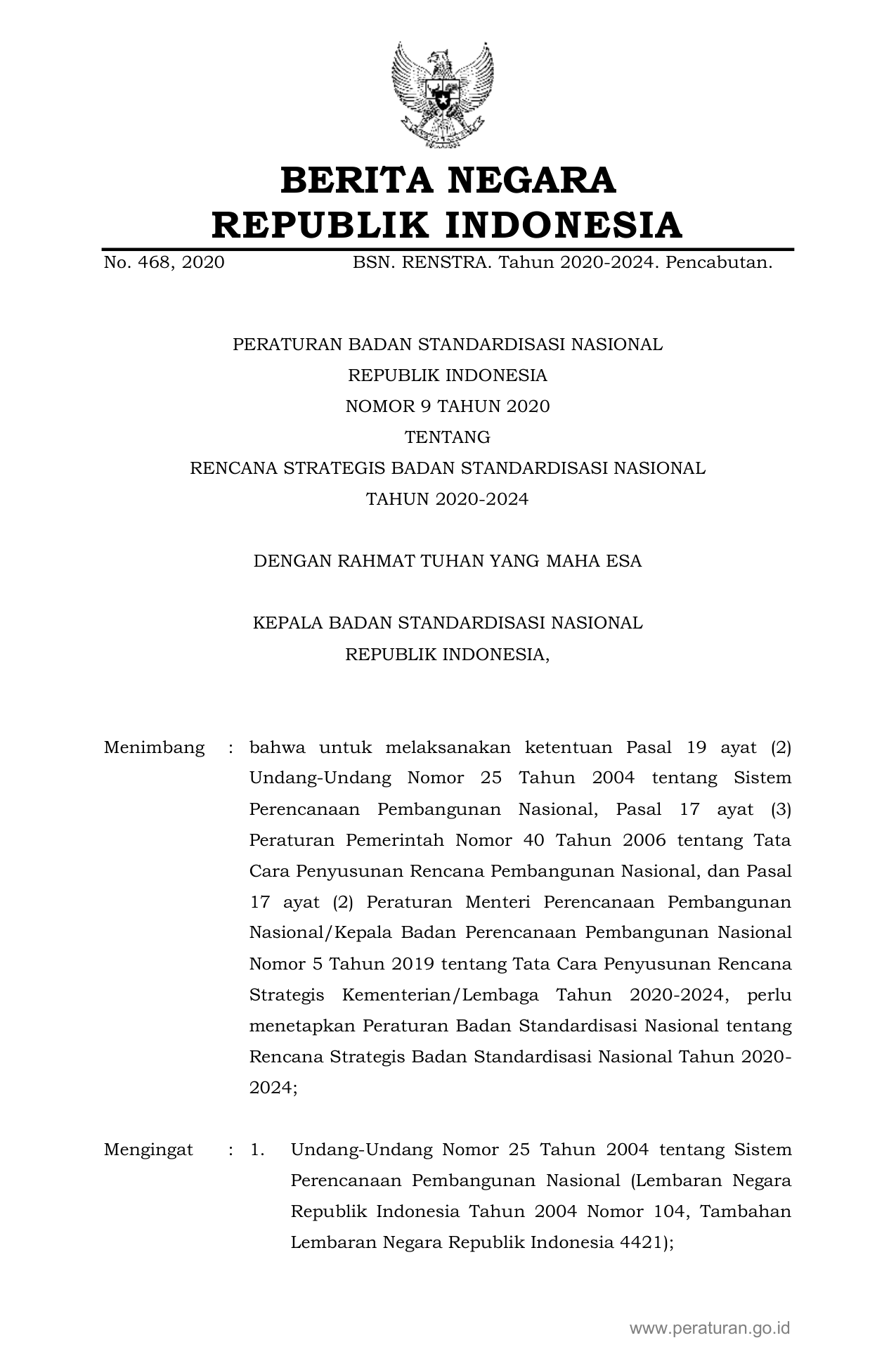 PERBAN Nomor 9 Tahun 2020 | Peraturan Badan Nomor 9 Tahun 2020 tentang RENCANA STRATEGIS BADAN STANDARDISASI NASIONAL TAHUN 2020-2024