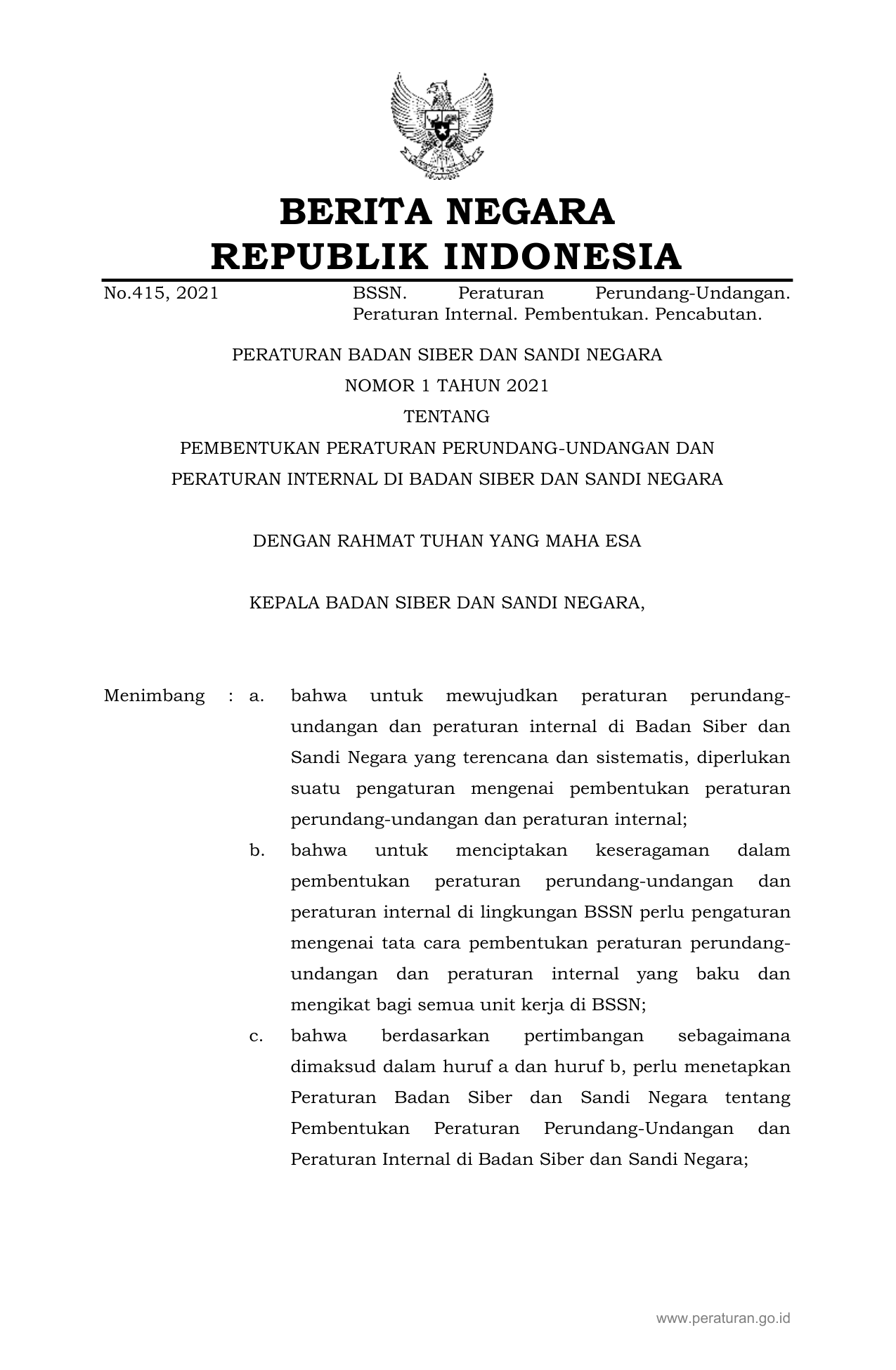 PERBAN Nomor 1 Tahun 2021 | Peraturan Badan Nomor 1 Tahun 2021 tentang PEMBENTUKAN PERATURAN PERUNDANG-UNDANGAN DAN PERATURAN INTERNAL DI BADAN SIBER DAN SANDI NEGARA