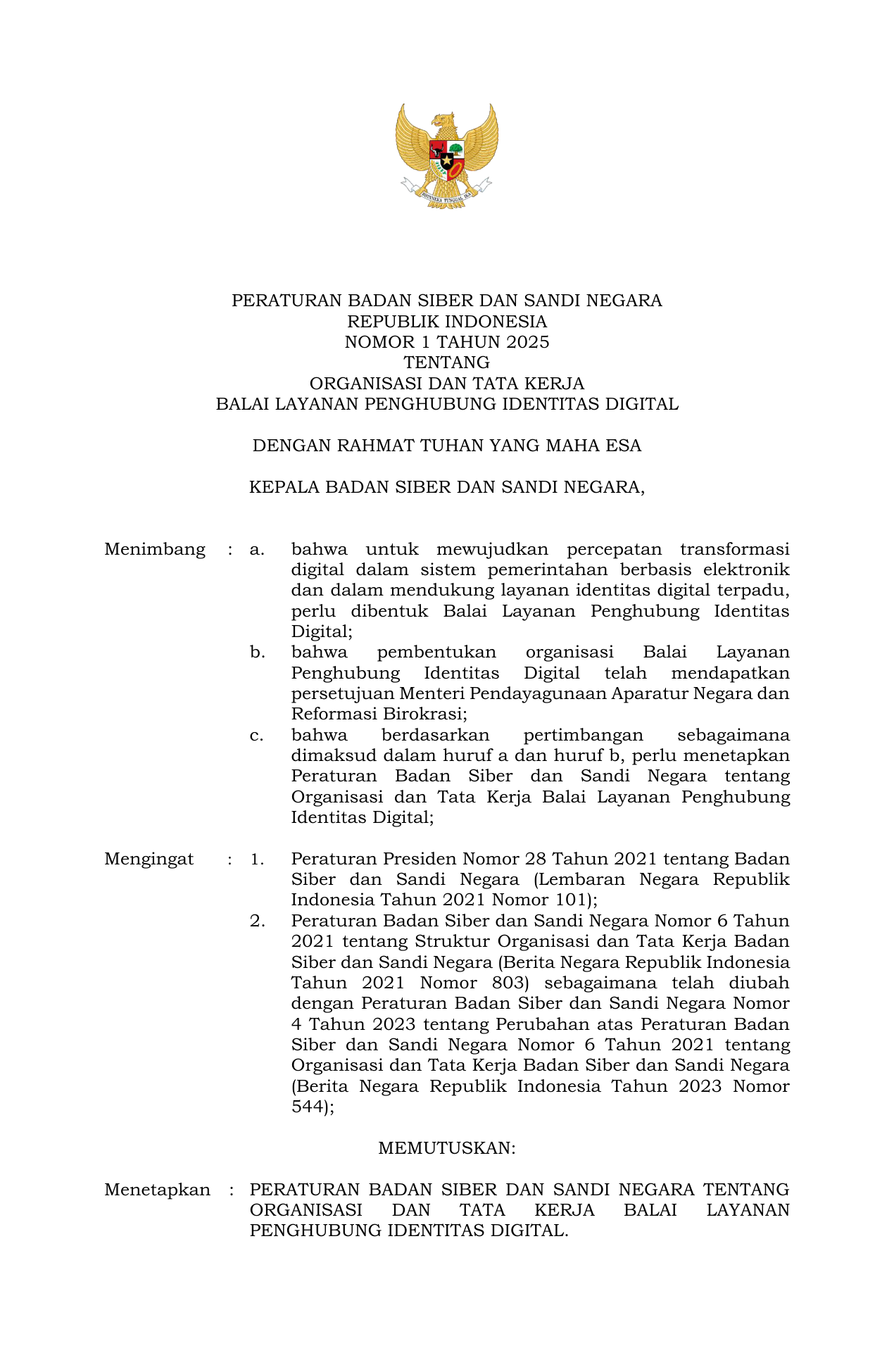 PERBAN Nomor 1 Tahun 2025 | Peraturan Badan Nomor 1 Tahun 2025 tentang Organisasi dan Tata Kerja Balai Layanan Penghubung Identitas Digital