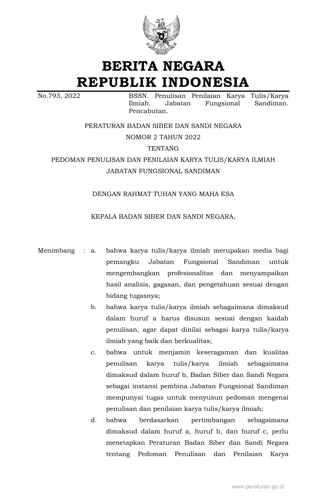 PERBAN Nomor 2 Tahun 2022 | Peraturan Badan Nomor 2 Tahun 2022 tentang PEDOMAN PENULISAN DAN PENILAIAN KARYA TULIS/KARYA ILMIAH JABATAN FUNGSIONAL SANDIMAN