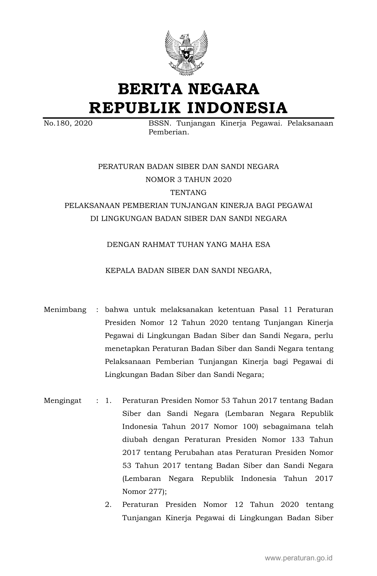 PERBAN Nomor 3 Tahun 2020 | Peraturan Badan Nomor 3 Tahun 2020 tentang PELAKSANAAN PEMBERIAN TUNJANGAN KINERJA BAGI PEGAWAIDI LINGKUNGAN BADAN SIBER DAN SANDI NEGARA