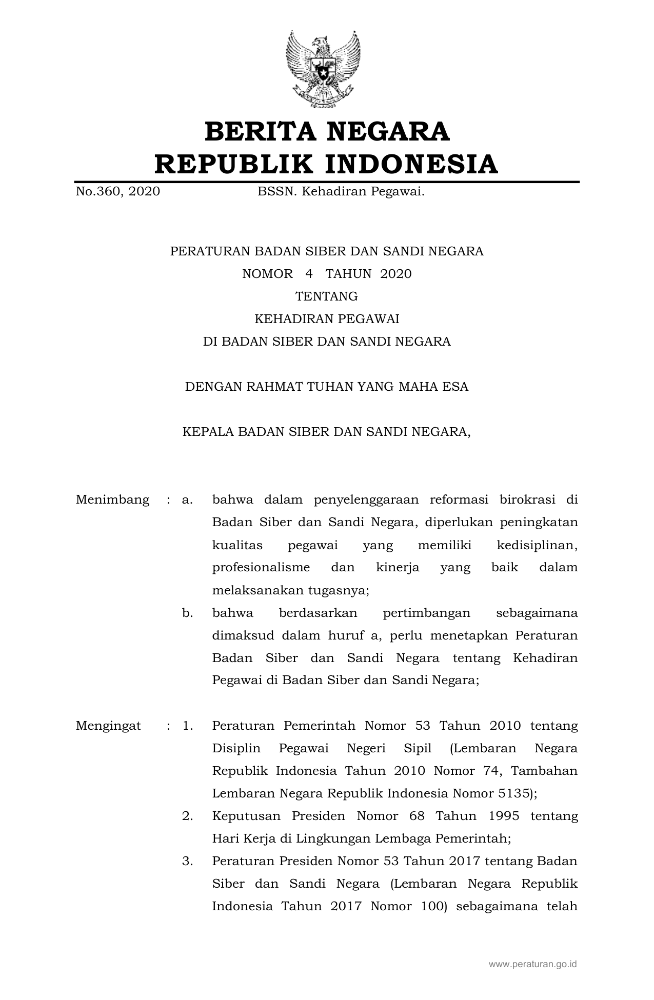 PERBAN Nomor 4 Tahun 2020 | Peraturan Badan Nomor 4 Tahun 2020 tentang KEHADIRAN PEGAWAI DI BADAN SIBER DAN SANDI NEGARA