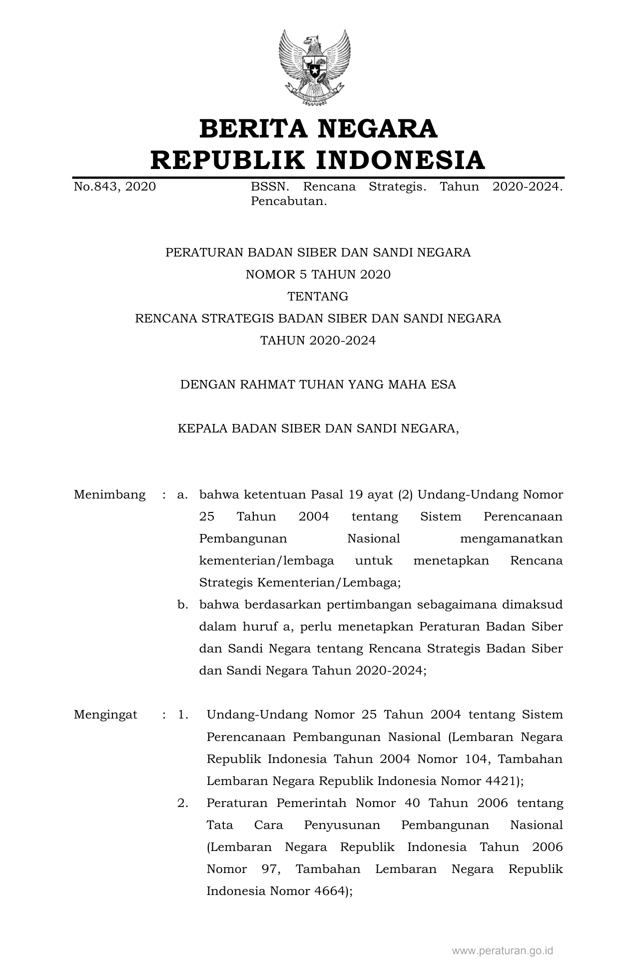 PERBAN Nomor 5 Tahun 2020 | Peraturan Badan Nomor 5 Tahun 2020 tentang RENCANA STRATEGIS BADAN SIBER DAN SANDI NEGARA TAHUN 2020-2024
