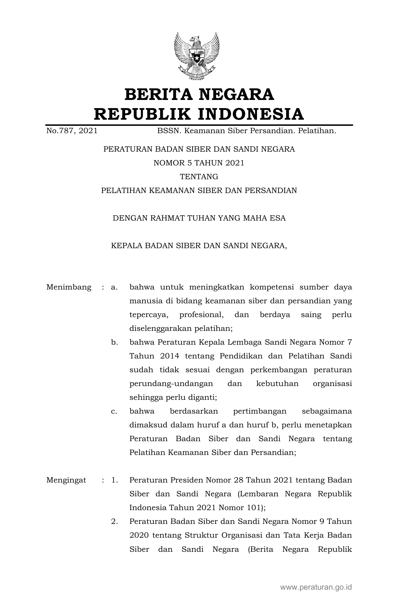 PERBAN Nomor 5 Tahun 2021 | Peraturan Badan Nomor 5 Tahun 2021 tentang PELATIHAN KEAMANAN SIBER DAN PERSANDIAN
