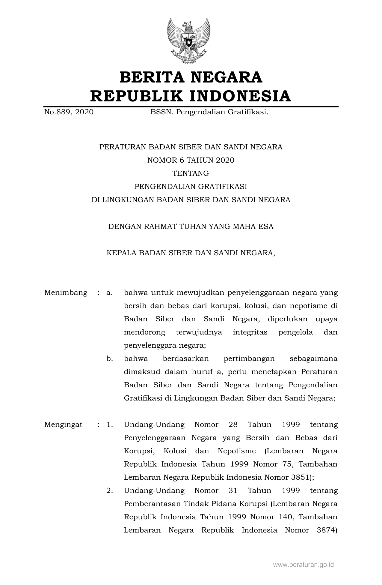 PERBAN Nomor 6 Tahun 2020 | Peraturan Badan Nomor 6 Tahun 2020 tentang PENGENDALIAN GRATIFIKASI DI LINGKUNGAN BADAN SIBER DAN SANDI NEGARA