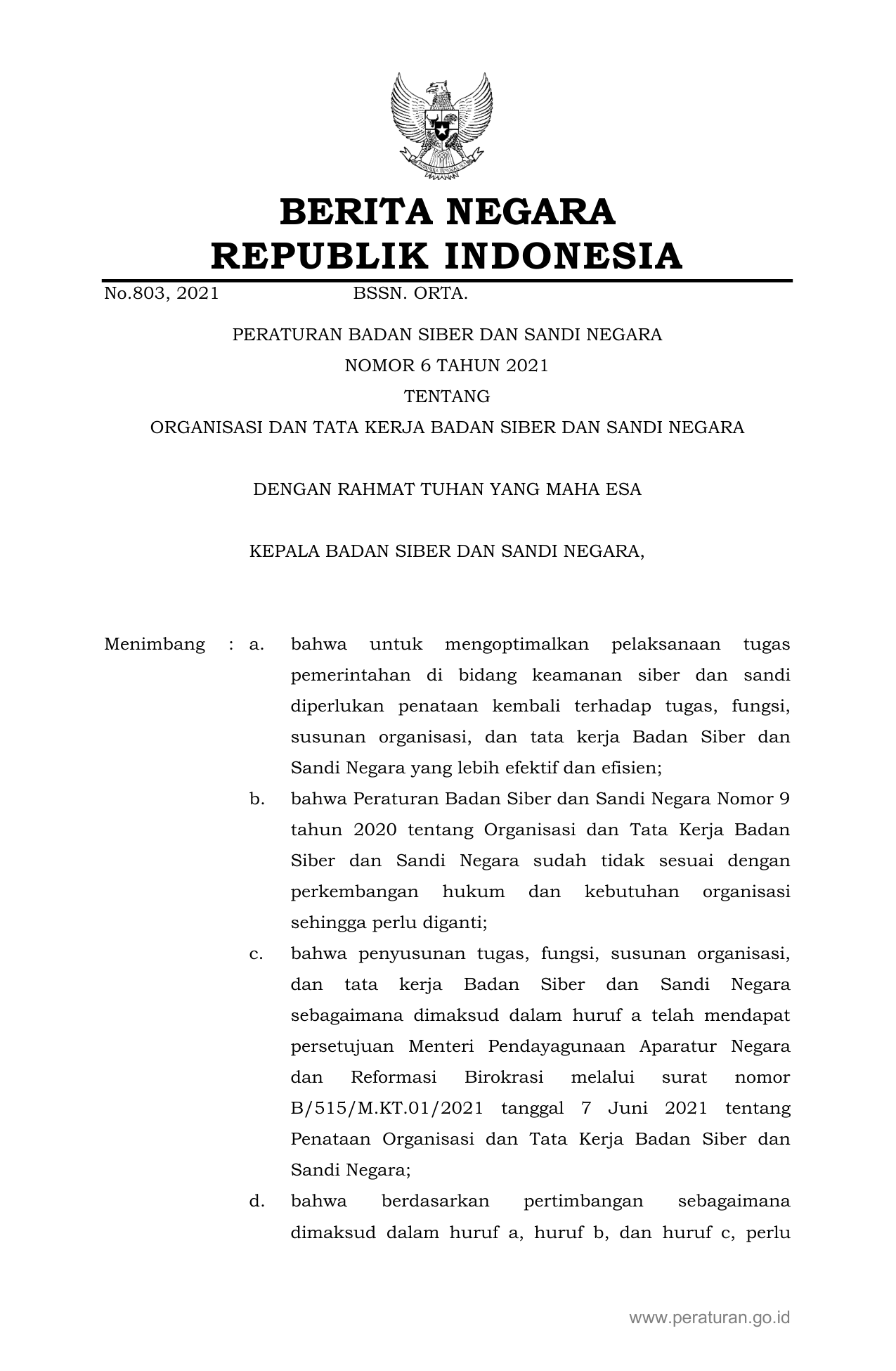 PERBAN Nomor 6 Tahun 2021 | Peraturan Badan Nomor 6 Tahun 2021 tentang ORGANISASI DAN TATA KERJA BADAN SIBER DAN SANDI NEGARA