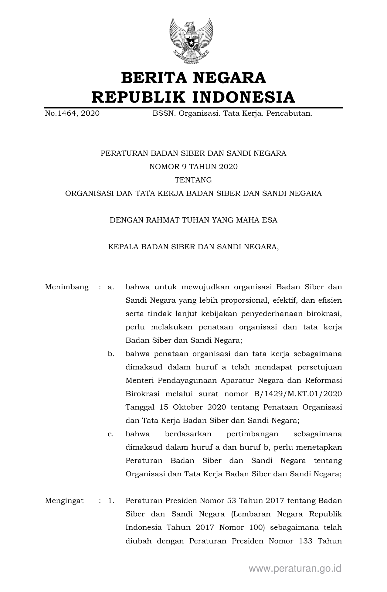 PERBAN Nomor 9 Tahun 2020 | Peraturan Badan Nomor 9 Tahun 2020 tentang ORGANISASI DAN TATA KERJA BADAN SIBER DAN SANDI NEGARA