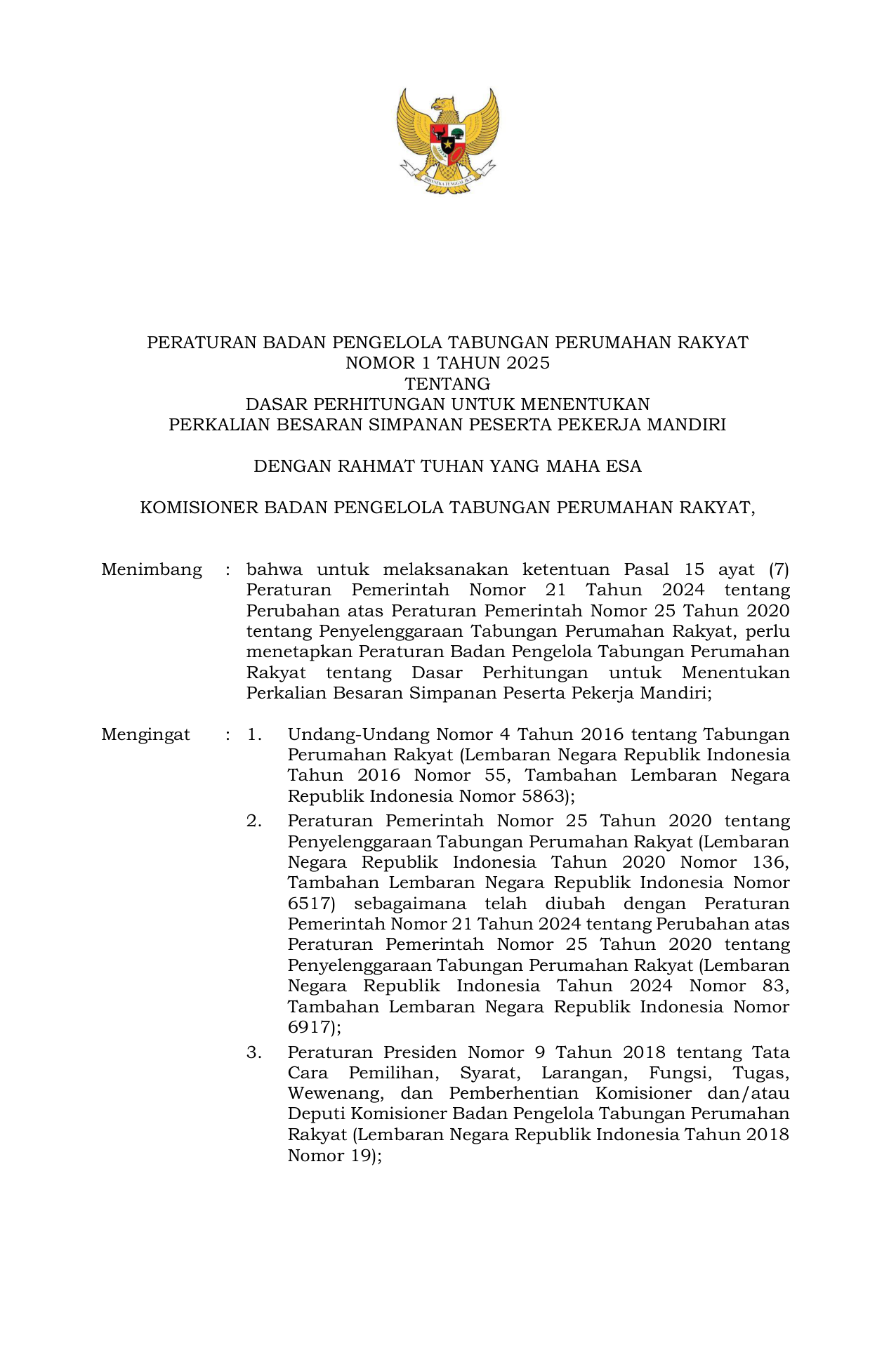 PERBAN Nomor 1 Tahun 2025 | Peraturan Badan Nomor 1 Tahun 2025 tentang Dasar Perhitungan untuk Menentukan Perkalian Besaran Simpanan Peserta Pekerja Mandiri
