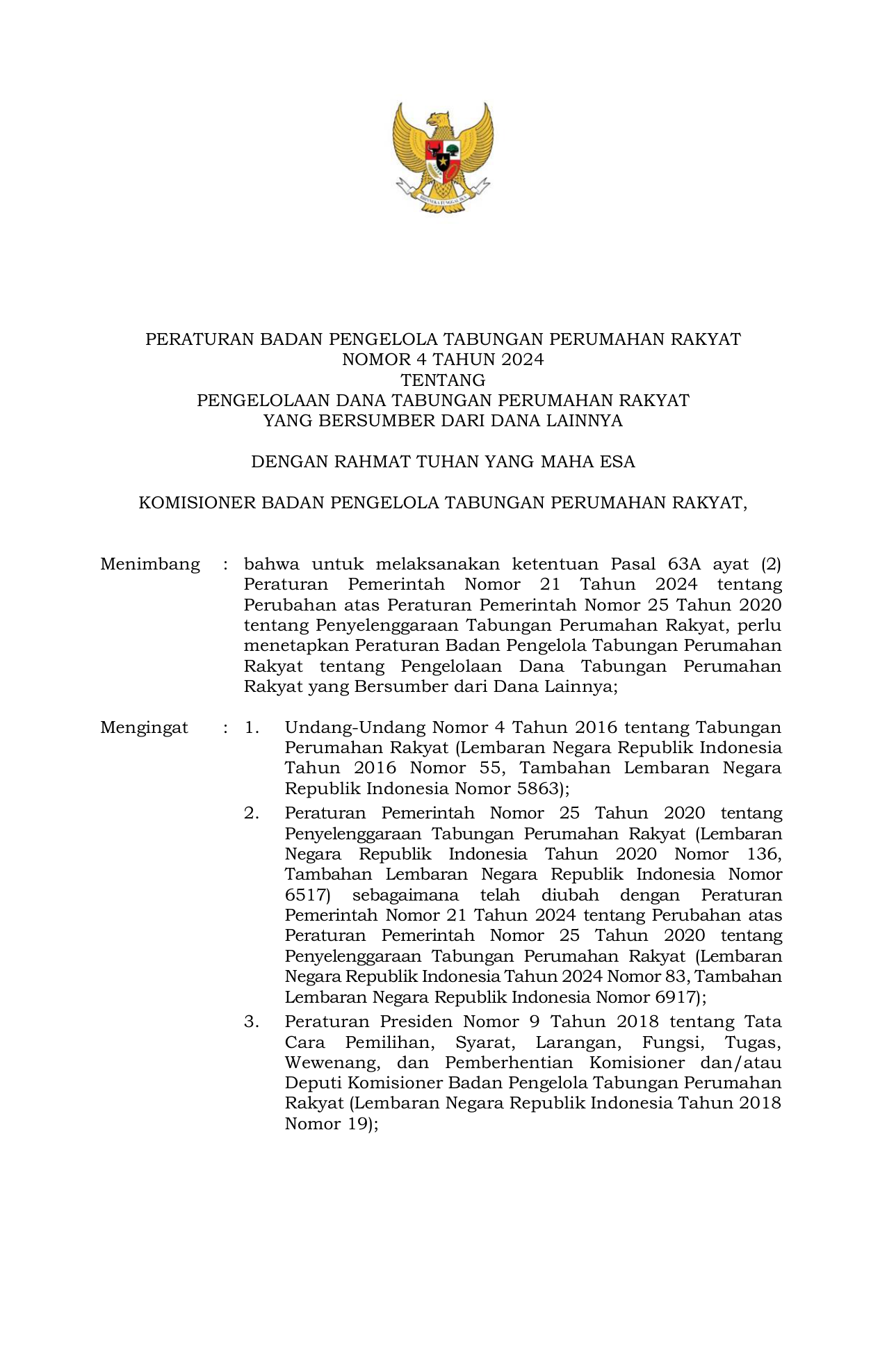 PERBAN Nomor 4 Tahun 2024 | Peraturan Badan Nomor 4 Tahun 2024 tentang Pengelolaan Dana Tabungan Perumahan Rakyat yang Bersumber Dari Dana Lainnya