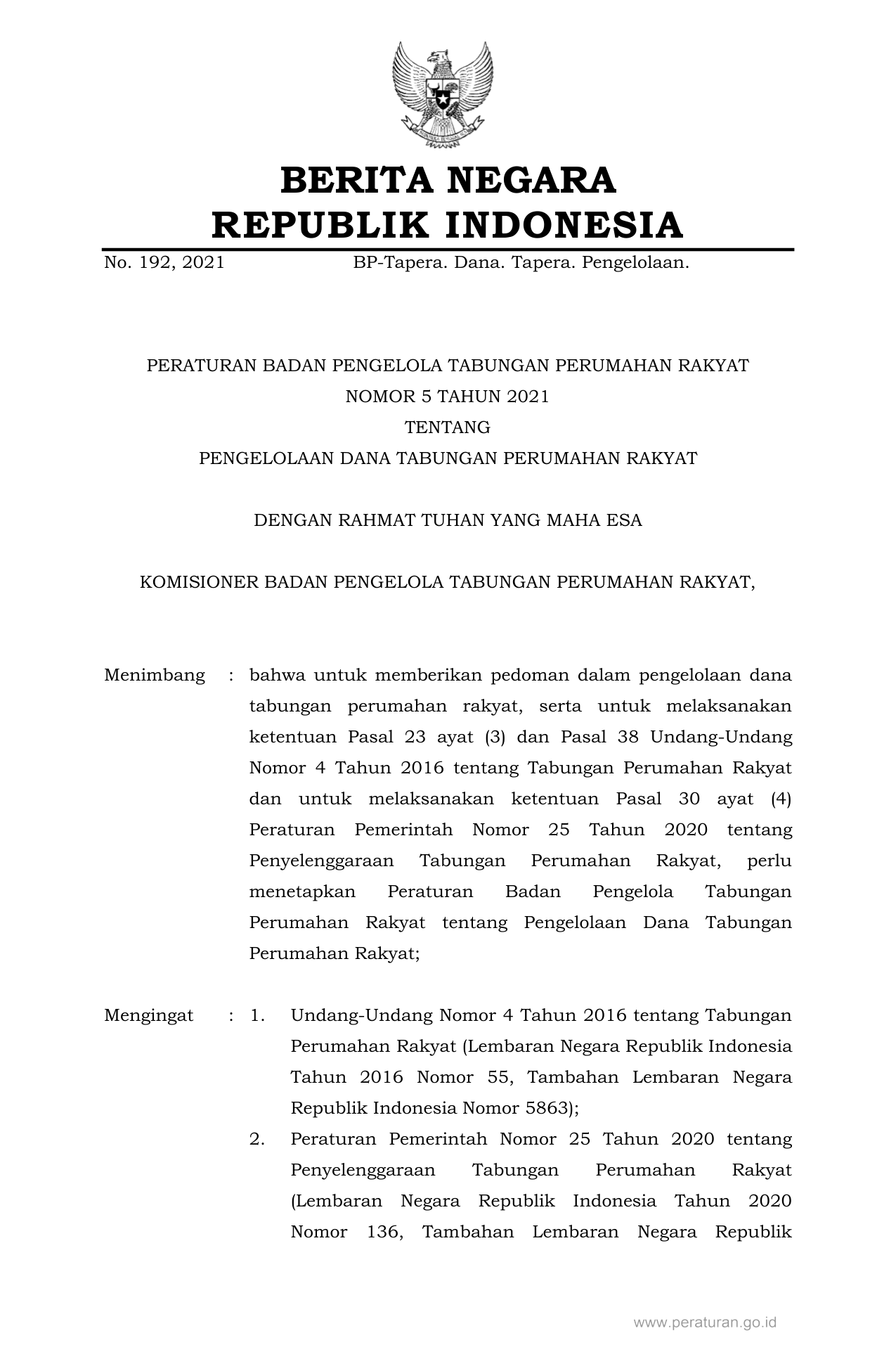 PERBAN Nomor 5 Tahun 2021 | Peraturan Badan Nomor 5 Tahun 2021 tentang PENGELOLAAN DANA TABUNGAN PERUMAHAN RAKYAT