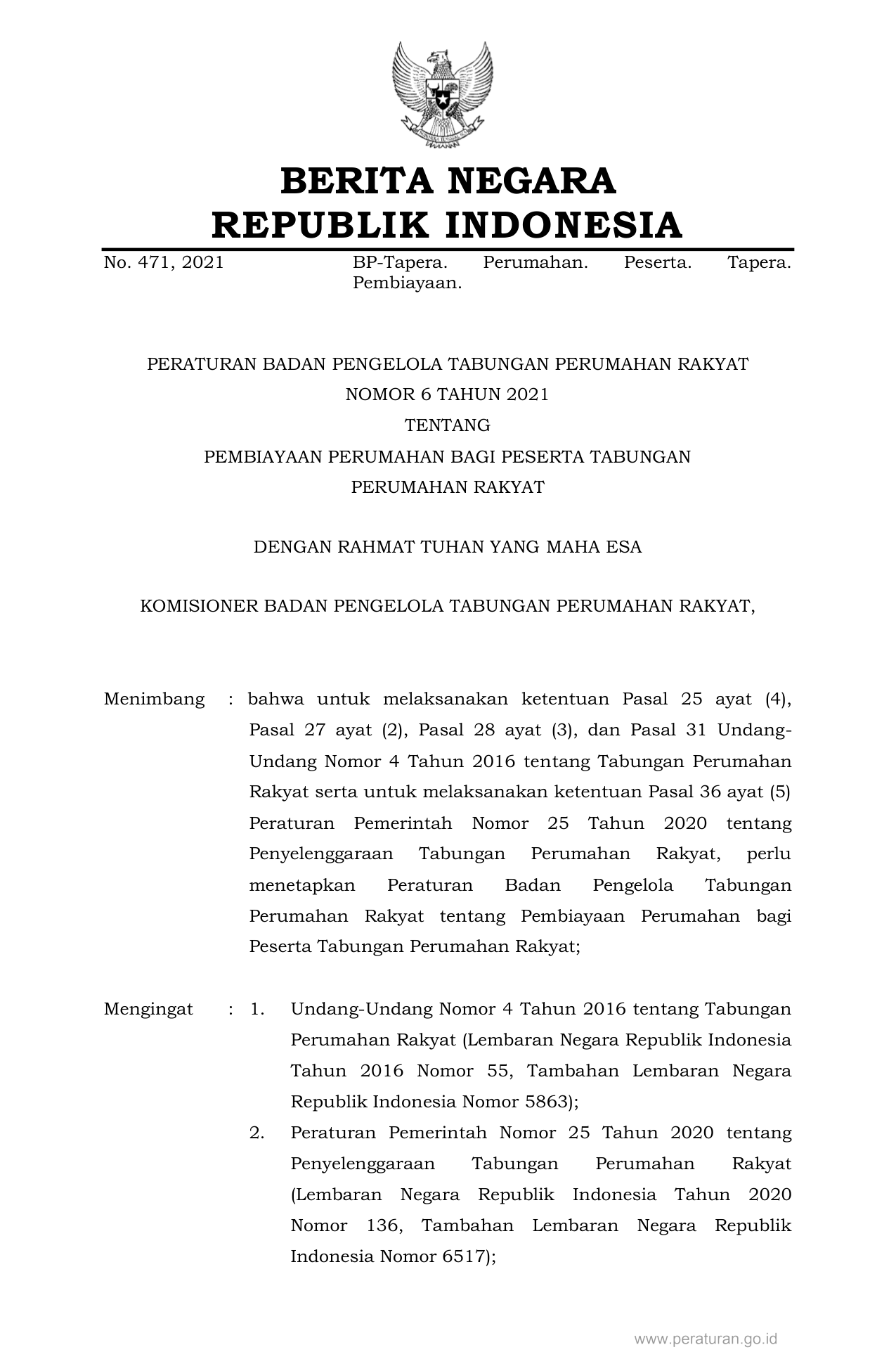 PERBAN Nomor 6 Tahun 2021 | Peraturan Badan Nomor 6 Tahun 2021 tentang PEMBIAYAAN PERUMAHAN BAGI PESERTA TABUNGAN PERUMAHAN RAKYAT