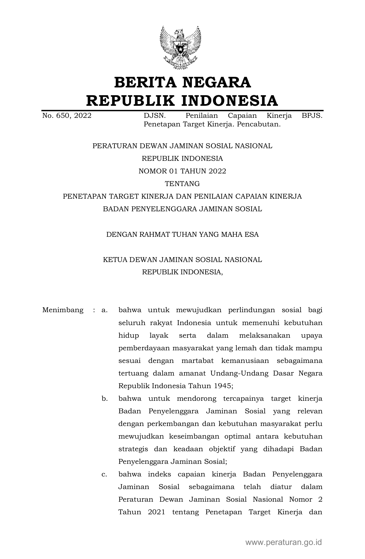 PERBAN Nomor 1 Tahun 2022 | Peraturan Badan Nomor 1 Tahun 2022 tentang PENETAPAN TARGET KINERJA DAN PENILAIAN CAPAIAN KINERJA BADAN PENYELENGGARA JAMINAN SOSIAL