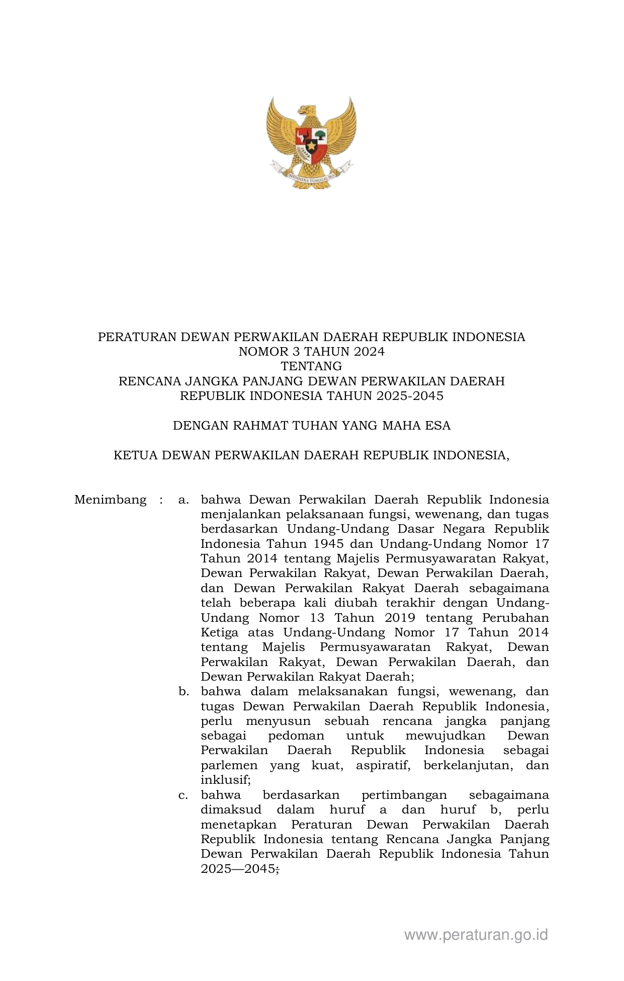 PERBAN Nomor 3 Tahun 2024 | Peraturan Badan Nomor 3 Tahun 2024 tentang RENCANA JANGKA PANJANG DEWAN PERWAKILAN DAERAH REPUBLIK INDONESIA TAHUN 2025-2045