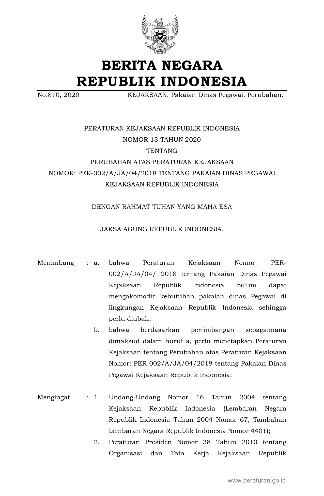PERBAN Nomor 13 Tahun 2020 | Peraturan Badan Nomor 13 Tahun 2020 tentang PERUBAHAN ATAS PERATURAN KEJAKSAAN NOMOR: PER-002/A/JA/04/2018 TENTANG PAKAIAN DINAS PEGAWAI KEJAKSAAN REPUBLIK INDONESIA
