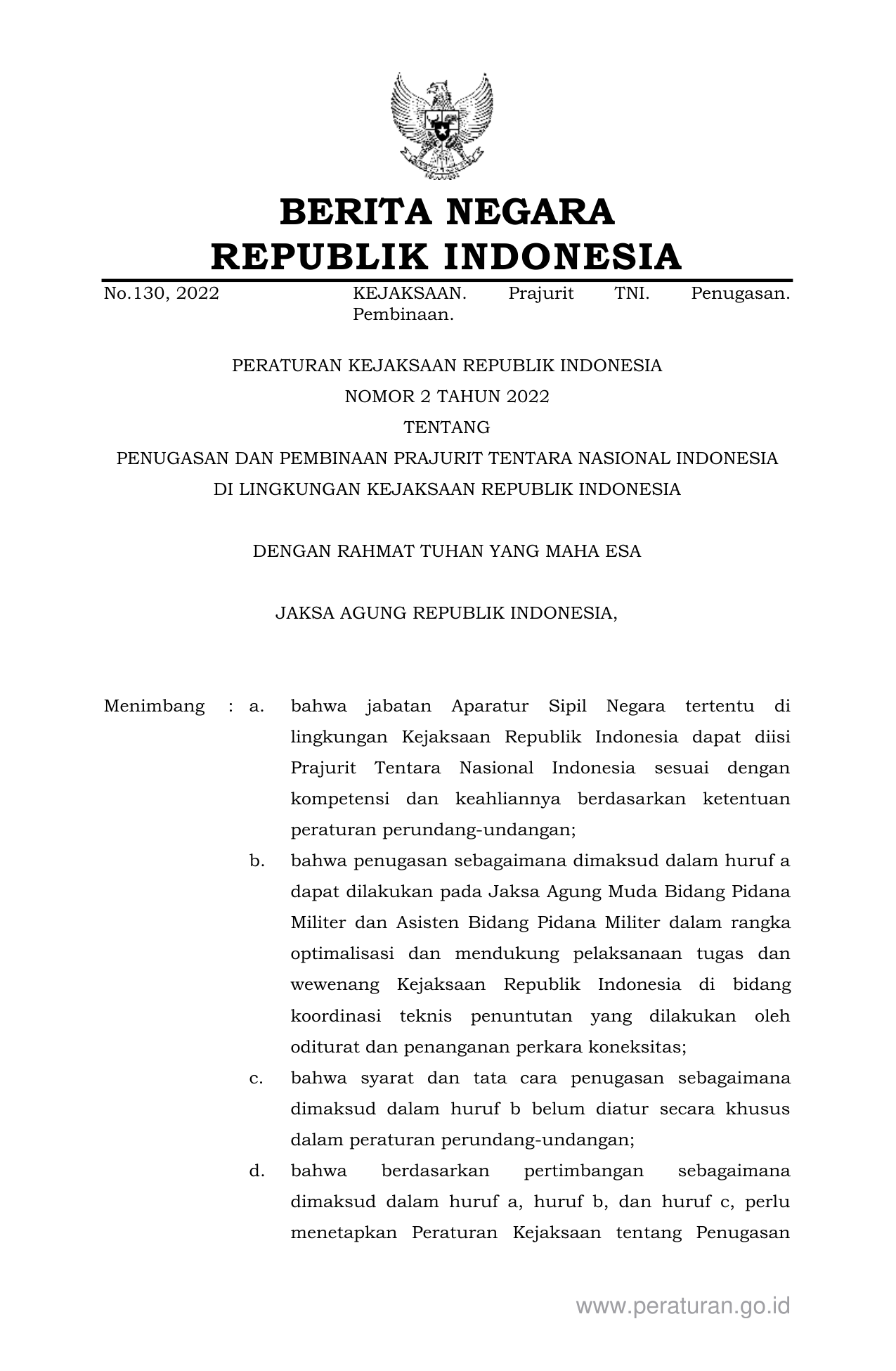 PERBAN Nomor 2 Tahun 2022 | Peraturan Badan Nomor 2 Tahun 2022 tentang PENUGASAN DAN PEMBINAAN PRAJURIT TENTARA NASIONAL INDONESIA DI LINGKUNGAN KEJAKSAAN REPUBLIK INDONESIA