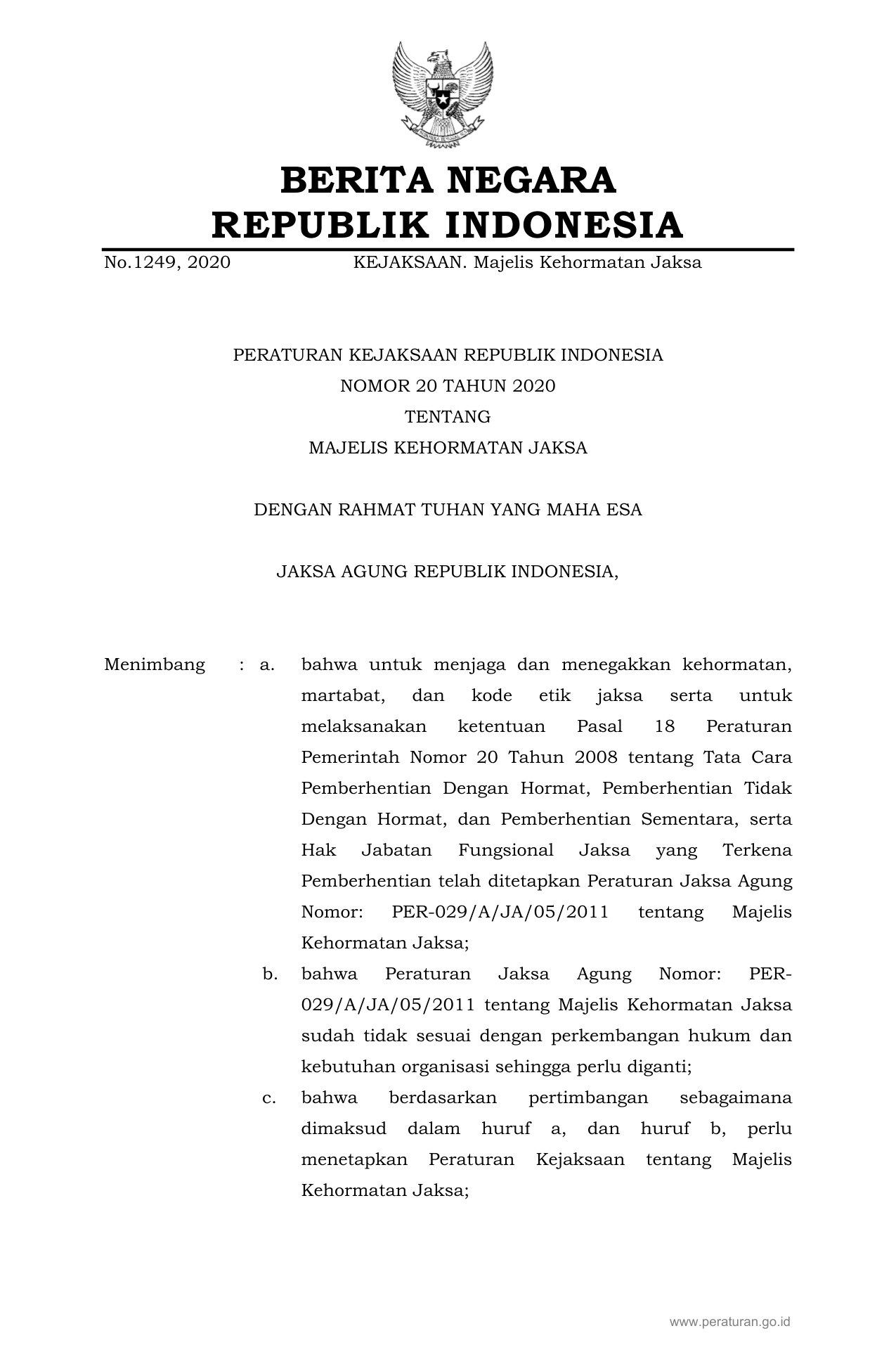 PERBAN Nomor 20 Tahun 2020 | Peraturan Badan Nomor 20 Tahun 2020 tentang MAJELIS KEHORMATAN JAKSA