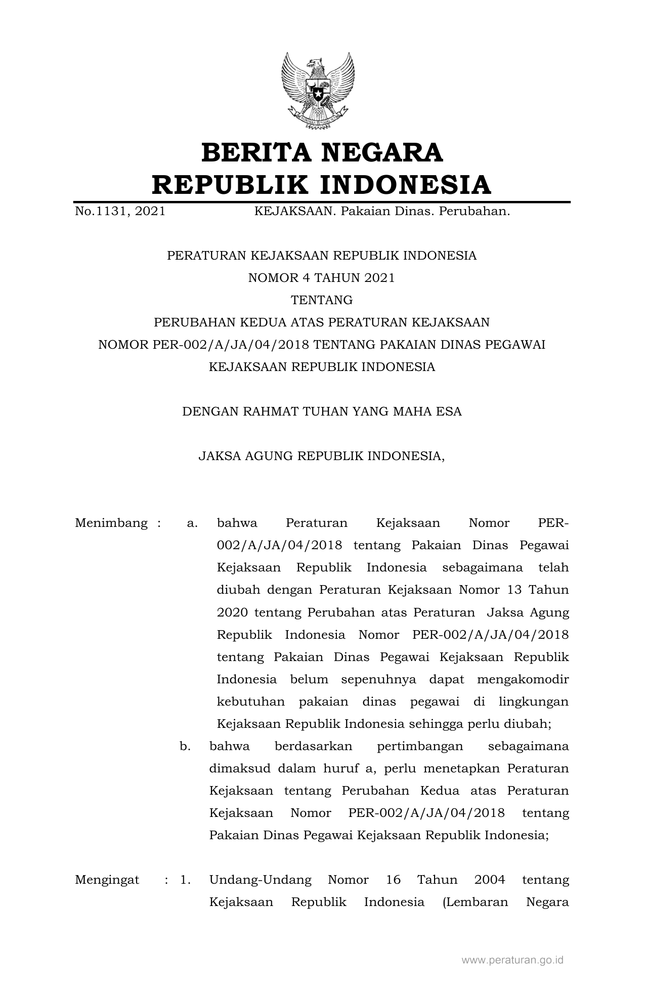 PERBAN Nomor 4 Tahun 2021 | Peraturan Badan Nomor 4 Tahun 2021 tentang PERUBAHAN KEDUA ATAS PERATURAN KEJAKSAAN NOMOR PER-002/A/JA/04/2018 TENTANG PAKAIAN DINAS PEGAWAI KEJAKSAAN REPUBLIK INDONESIA