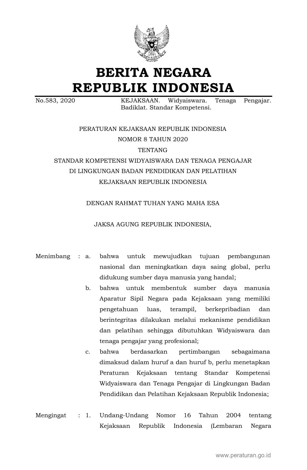 PERBAN Nomor 8 Tahun 2020 | Peraturan Badan Nomor 8 Tahun 2020 tentang STANDAR KOMPETENSI WIDYAISWARA DAN TENAGA PENGAJAR DI LINGKUNGAN BADAN PENDIDIKAN DAN PELATIHAN KEJAKSAAN REPUBLIK INDONESIA