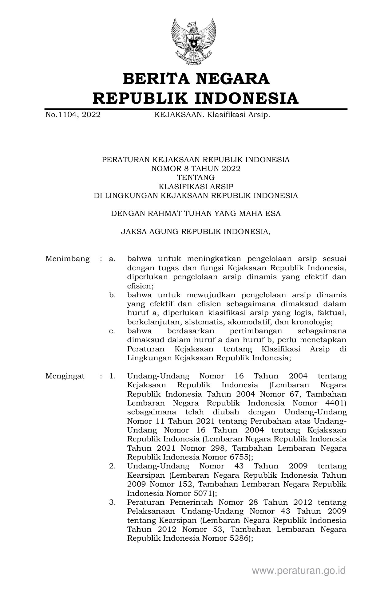 PERBAN Nomor 8 Tahun 2022 | Peraturan Badan Nomor 8 Tahun 2022 tentang KLASIFIKASI ARSIP DI LINGKUNGAN KEJAKSAAN REPUBLIK INDONESIA