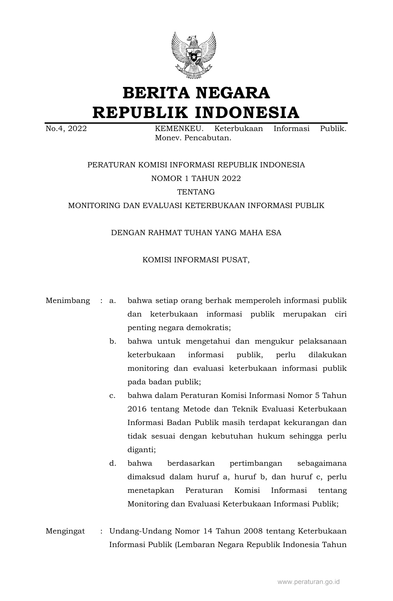 PERBAN Nomor 1 Tahun 2022 | Peraturan Badan Nomor 1 Tahun 2022 tentang MONITORING DAN EVALUASI KETERBUKAAN INFORMASI PUBLIK