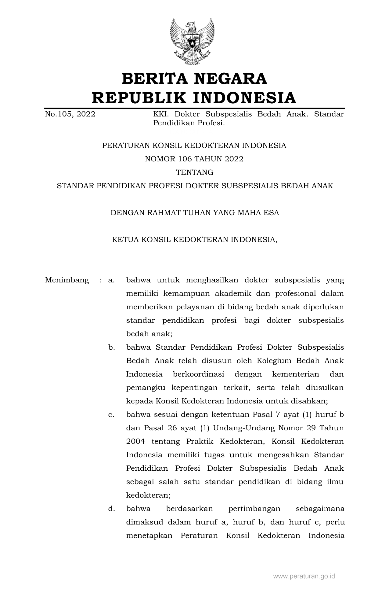 PERBAN Nomor 106 Tahun 2022 | Peraturan Badan Nomor 106 Tahun 2022 tentang STANDAR PENDIDIKAN PROFESI DOKTER SUBSPESIALIS BEDAH ANAK