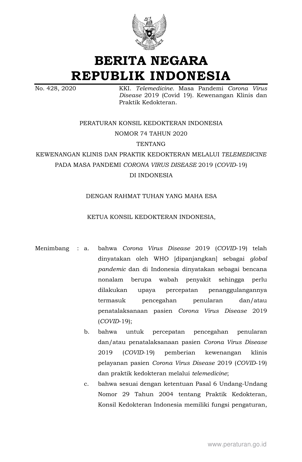 PERBAN Nomor 74 Tahun 2020 | Peraturan Badan Nomor 74 Tahun 2020 tentang KEWENANGAN KLINIS DAN PRAKTIK KEDOKTERAN MELALUI TELEMEDICINEPADA MASA PANDEMI CORONA VIRUS DISEASE 2019 (COVID-19) DI INDONESIA