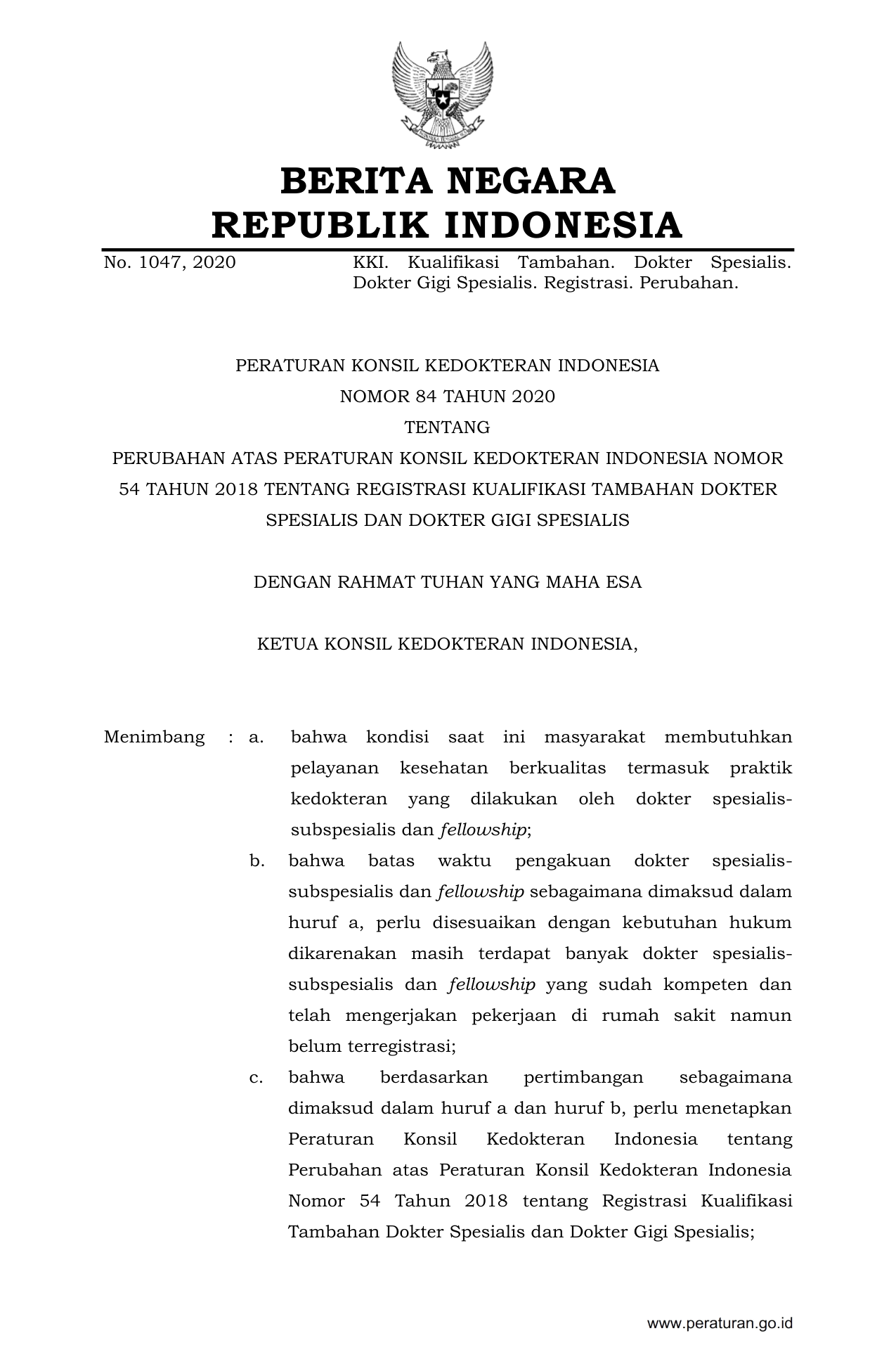PERBAN Nomor 84 Tahun 2020 | Peraturan Badan Nomor 84 Tahun 2020 tentang PERUBAHAN ATAS PERATURAN KONSIL KEDOKTERAN INDONESIA NOMOR54 TAHUN 2018 TENTANG REGISTRASI KUALIFIKASI TAMBAHAN DOKTERSPESIALIS DAN DOKTER GIGI SPESIALIS