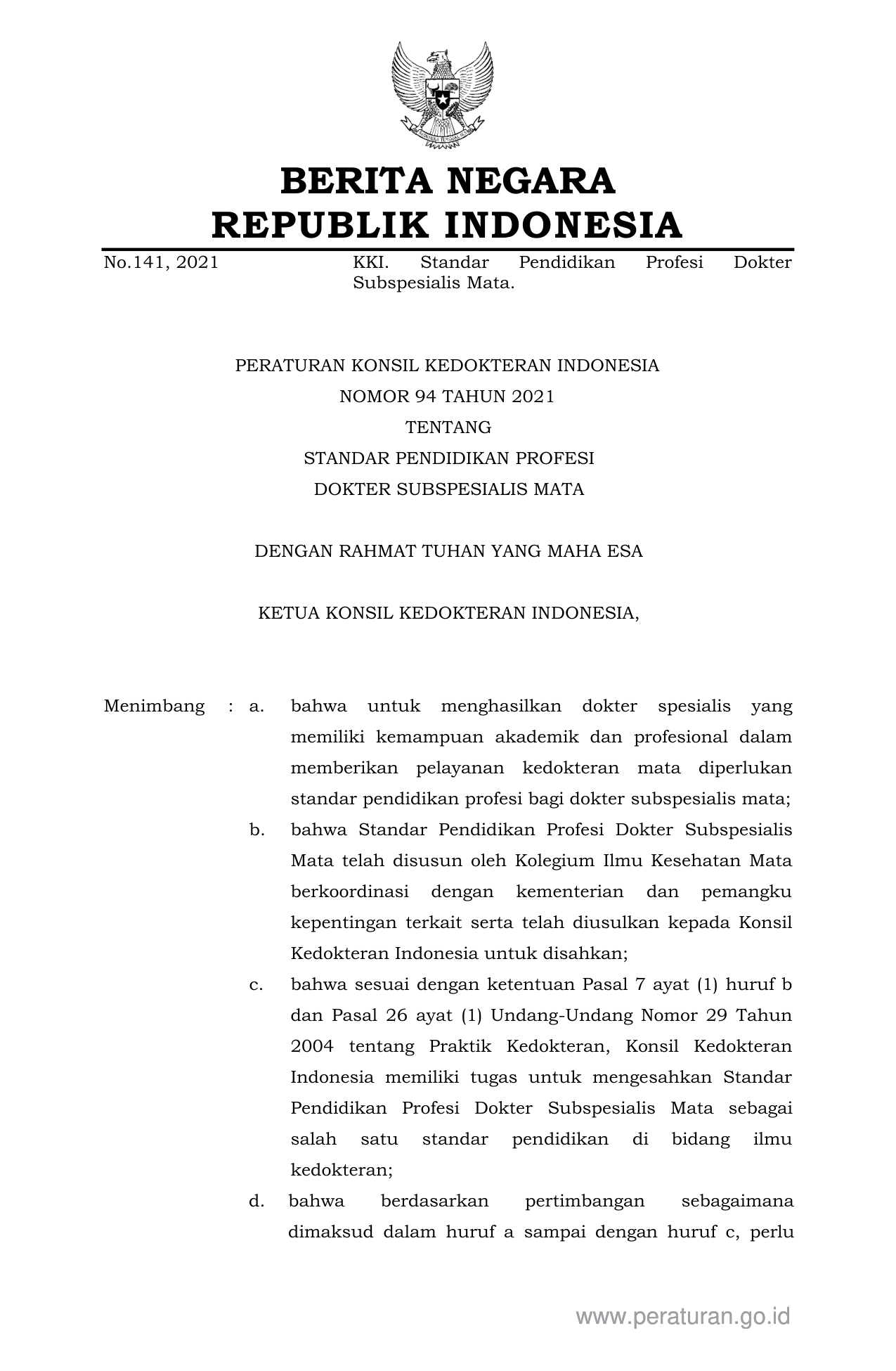PERBAN Nomor 94 Tahun 2021 | Peraturan Badan Nomor 94 Tahun 2021 tentang STANDAR PENDIDIKAN PROFESI DOKTER SUBSPESIALIS MATA
