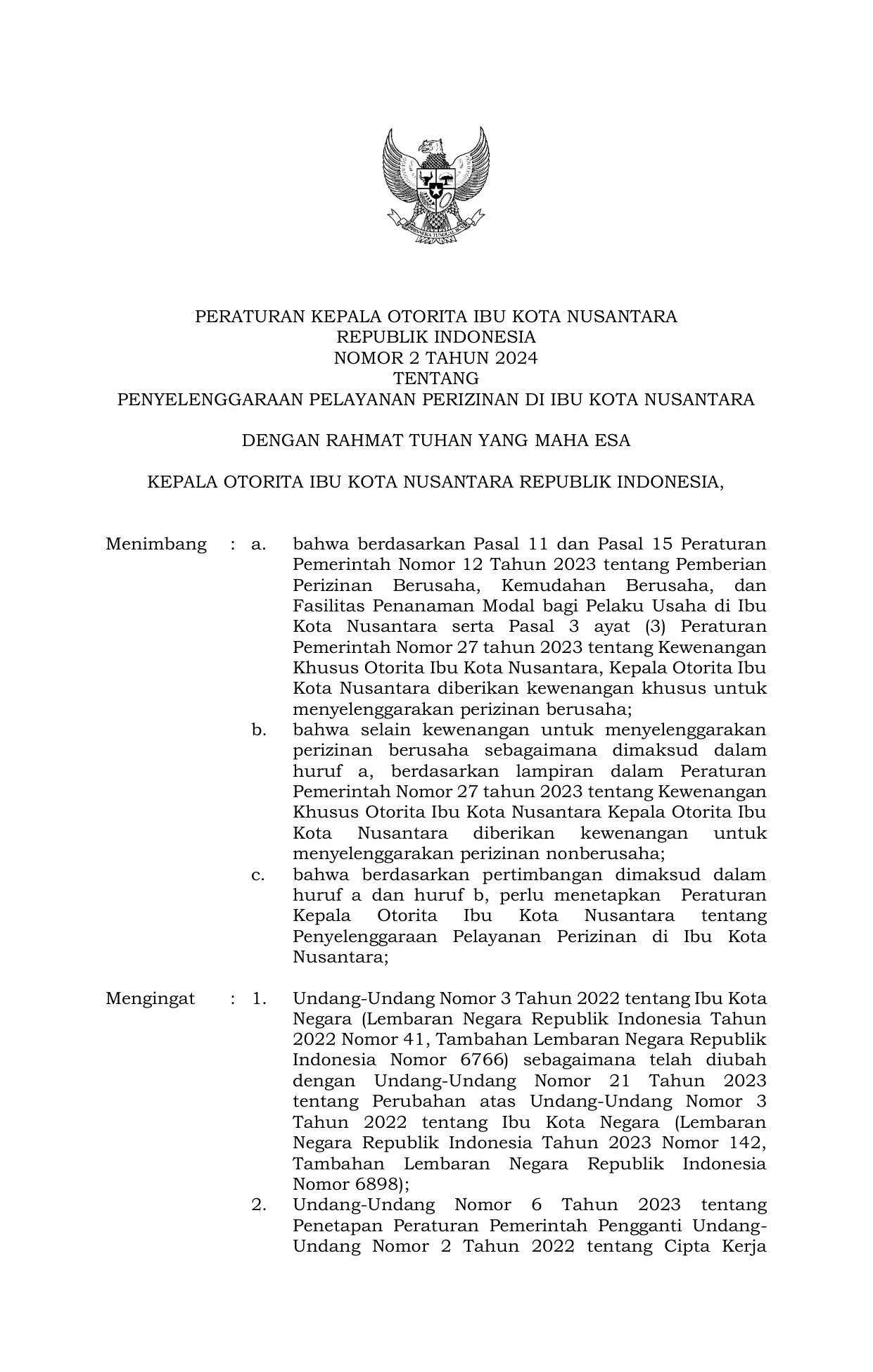 PERBAN Nomor 2 Tahun 2024 | Peraturan Badan Nomor 2 Tahun 2024 tentang PENYELENGGARAAN PELAYANAN PERIZINAN DI IBU KOTA NUSANTARA