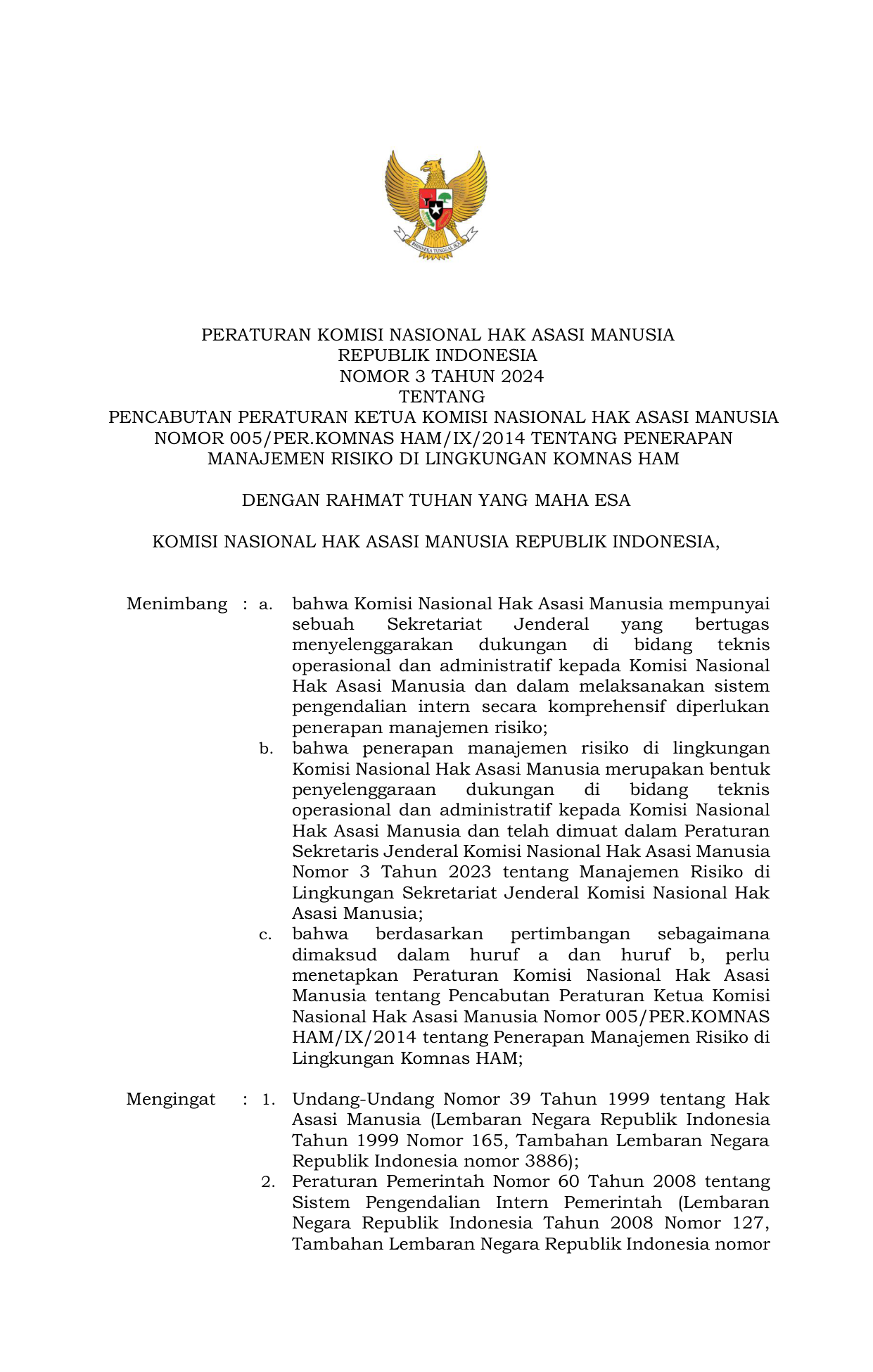 PERBAN Nomor 3 Tahun 2024 | Peraturan Badan Nomor 3 Tahun 2024 tentang PENCABUTAN PERATURAN KETUA KOMISI NASIONAL HAK ASASI MANUSIA NOMOR 005/PER.KOMNAS HAM/IX/2014 TENTANG PENERAPAN MANAJEMEN RISIKO DI LINGKUNGAN KOMNAS HAM