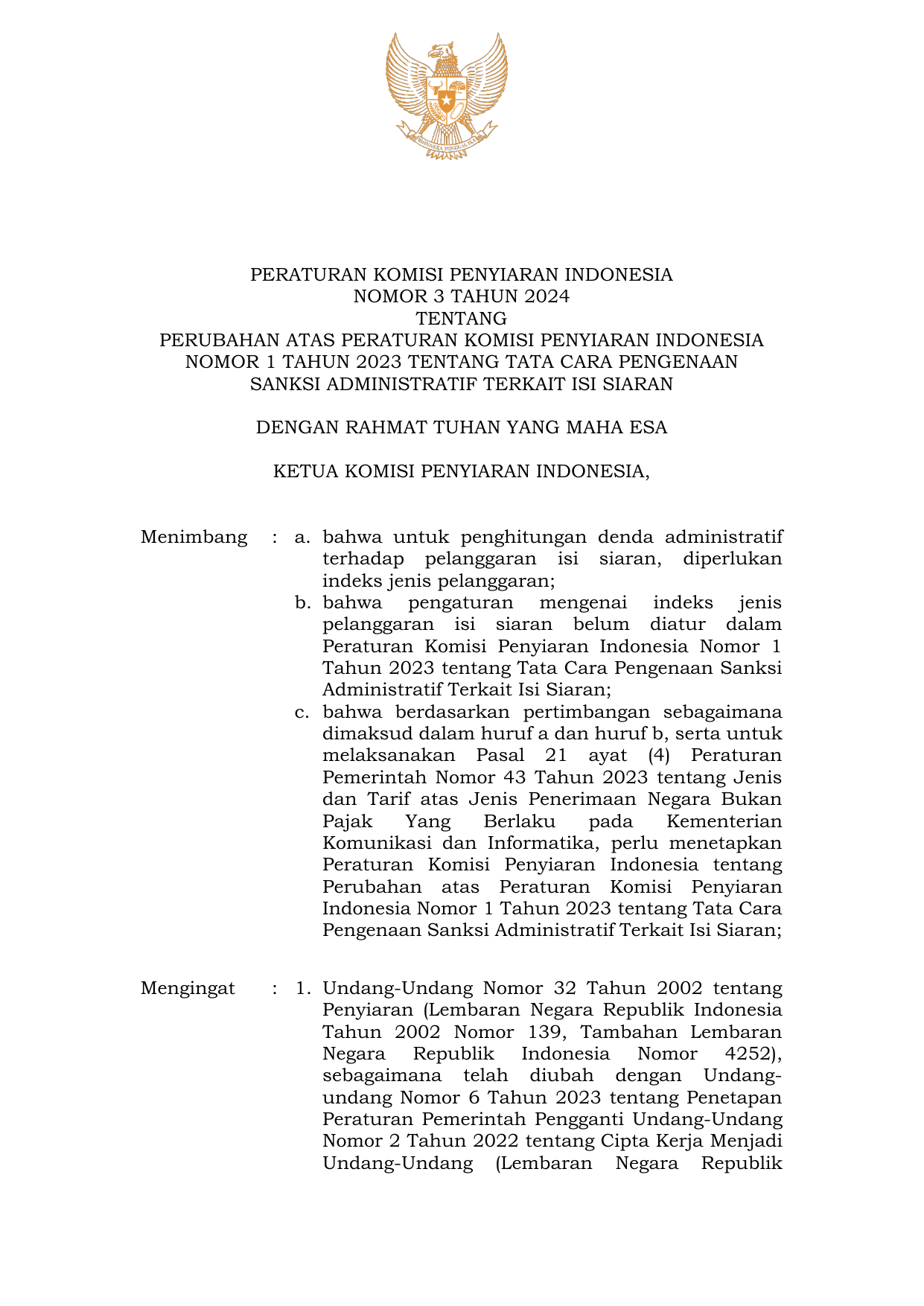 PERBAN Nomor 3 Tahun 2024 | Peraturan Badan Nomor 3 Tahun 2024 tentang PERUBAHAN ATAS PERATURAN KOMISI PENYIARAN INDONESIA NOMOR 1 TAHUN 2023 TENTANG TATA CARA PENGENAAN SANKSI ADMINISTRATIF TERKAIT ISI SIARAN