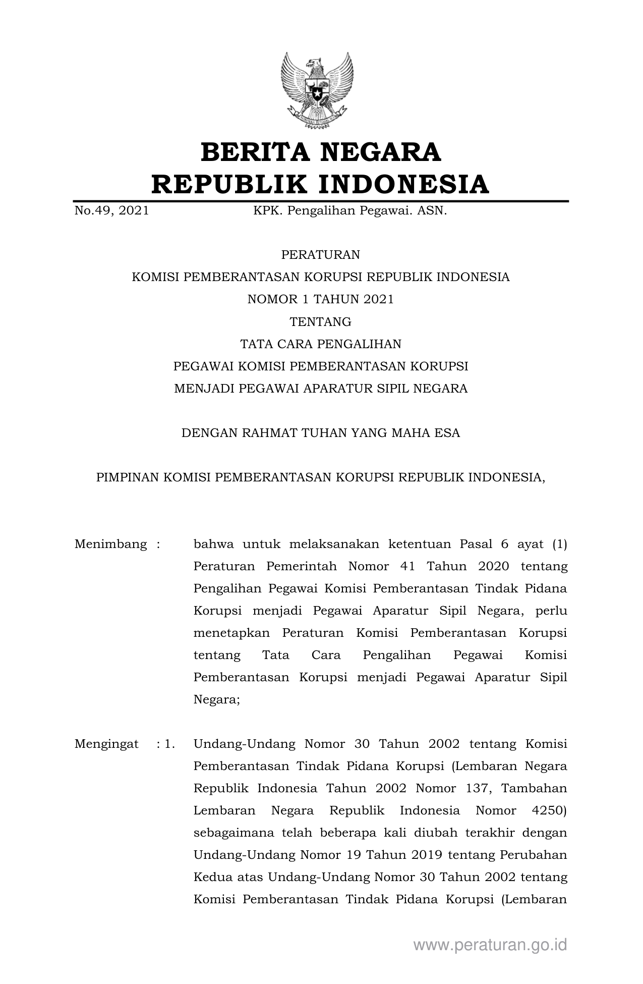 PERBAN Nomor 1 Tahun 2021 | Peraturan Badan Nomor 1 Tahun 2021 tentang TATA CARA PENGALIHAN PEGAWAI KOMISI PEMBERANTASAN KORUPSIMENJADI PEGAWAI APARATUR SIPIL NEGARA