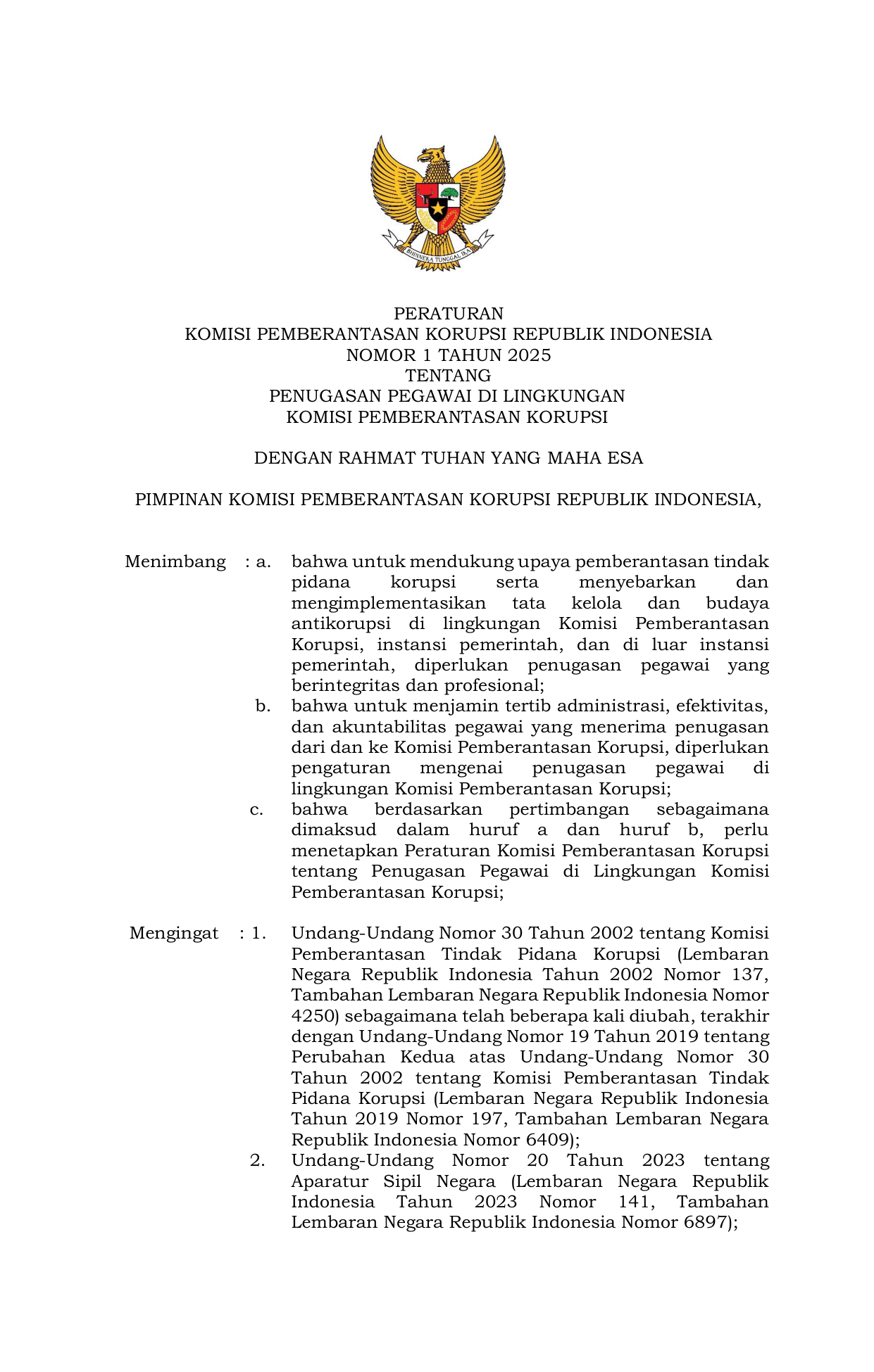 PERBAN Nomor 1 Tahun 2025 | Peraturan Badan Nomor 1 Tahun 2025 tentang PENUGASAN PEGAWAI DI LINGKUNGAN KOMISI PEMBERANTASAN KORUPSI