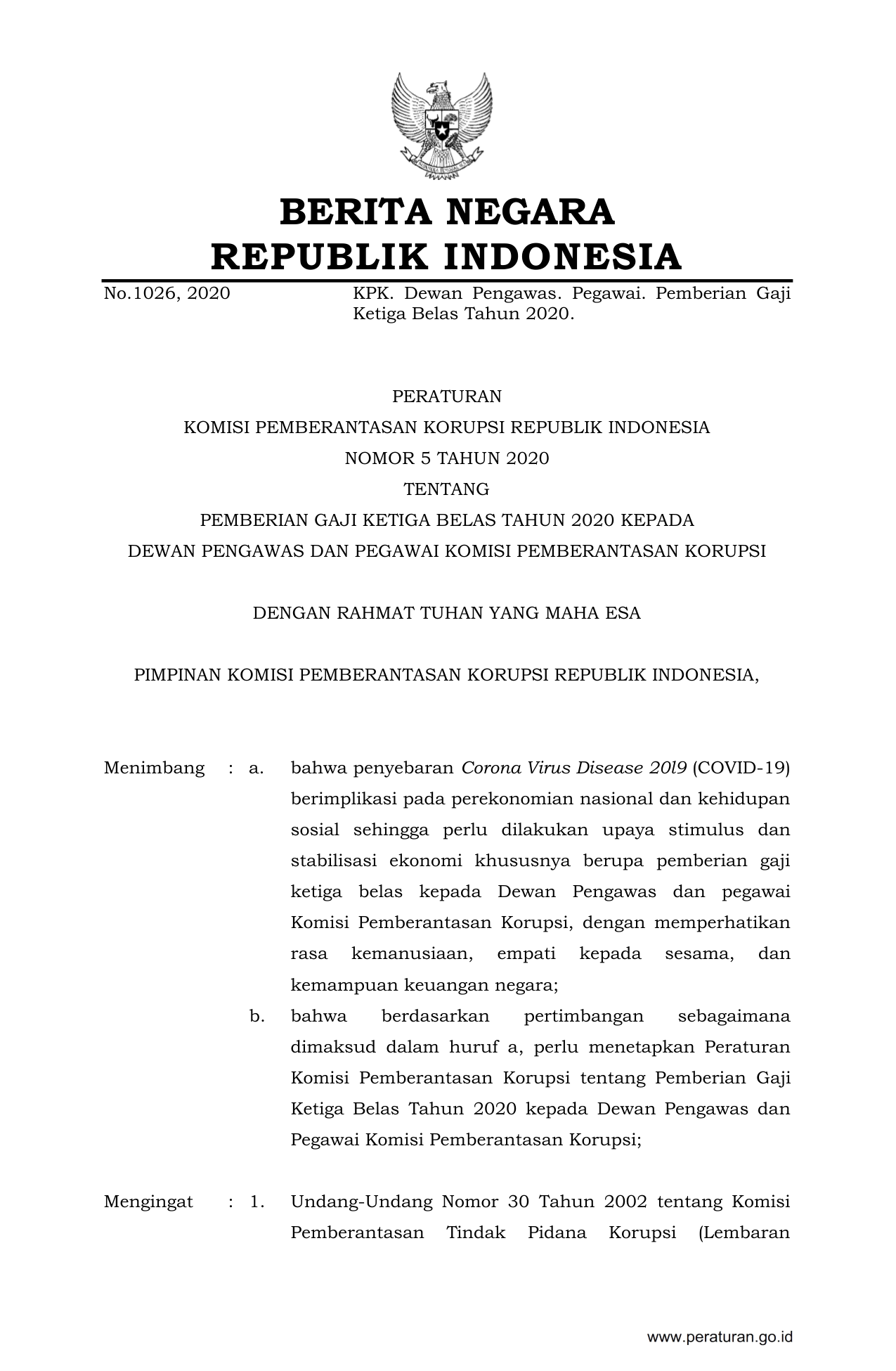 PERBAN Nomor 5 Tahun 2020 | Peraturan Badan Nomor 5 Tahun 2020 tentang PEMBERIAN GAJI KETIGA BELAS TAHUN 2020 KEPADA DEWAN PENGAWAS DAN PEGAWAI KOMISI PEMBERANTASAN KORUPSI